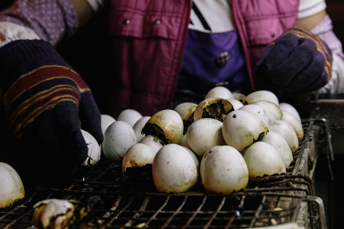 Помимо относительно привычных и понятных европейцам блюд, на улицах Китая торгуют и стрит-фудом, рассчитанным в основном на местных жителей. Жареные куриные головы и шеи, голуби на вертеле, печеные яйца с зародышами цыплят. Российских граждан у этого прилавка, кроме нас, видно не было, зато китайцы закупали еду активно. После некоторых сомнений, для чистоты эксперимента, мы решили попробовать и это. У китаянки в маске и теплых перчатках были куплены одна куриная голова, одно яйцо и один голубь. Все это было при нас снято с вертела, полито чесночным соусом и упаковано в полиэтиленовые пакеты. Ели, не отходя от кассы, за уличными столиками, в полумраке.