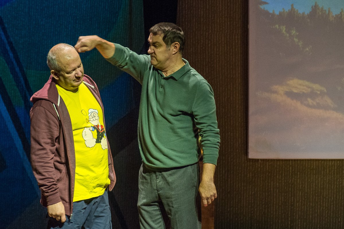 После спектакля трио Марзликин, Юшкевич и Марьянов в гримерке пообщались с журналистами.