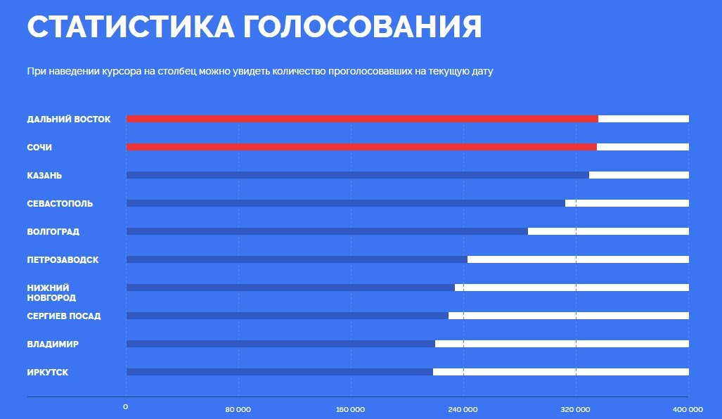 Более 335 тысяч голосов отдано за вариант «Дальний Восток» — он опередил город Сочи с двумя символами Роза-Хутор и олимпийский стадион «Фишт» — меньше, чем на тысячу голосов. На третьем месте остается Казань с 329 тысячами голосов.