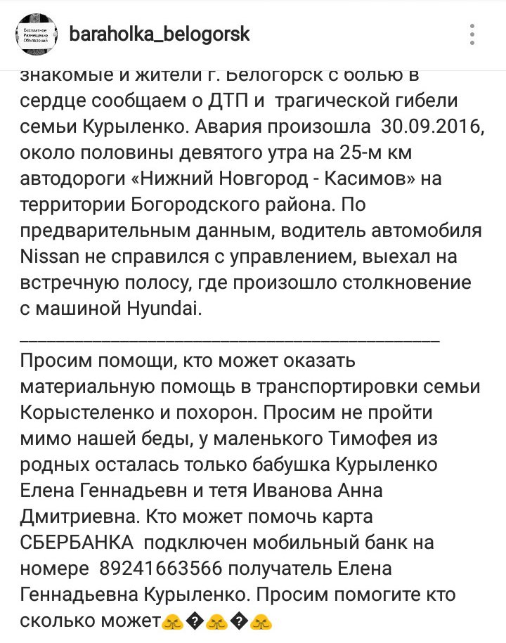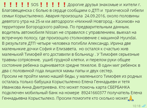 Редкий человек не испытал желания помочь, прочитав это страшное известие, сопровождавшееся фотографией красивого и счастливого семейства. Людям предлагалось перечислять средства на карту, привязанную к указанному номеру телефона. Разумеется, просьба о помощи не осталась неуслышанной.
