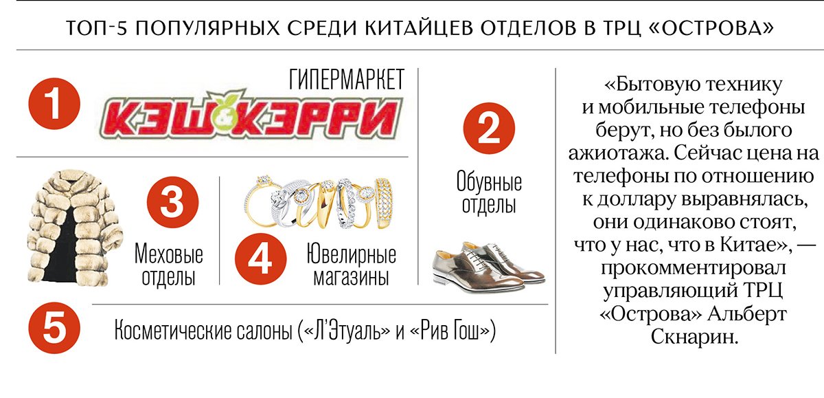 Из амурских супермаркетов китайские туристы выходят с полными тележками. Как отметила руководитель коммерческого отдела «Кэш-энд-Кэрри» Наталья Марковец, большим спросом у жителей КНР пользуются российский шоколад и конфеты, а также сыры и морские деликатесы, в том числе охлажденные крабы. Кроме того, сейчас жителям КНР стало выгодно покупать в России бытовую химию и косметические средства, особенно дорогих марок, и духи. В магазинах «Л’Этуаль» и «Рив Гош» китайских покупателей, пожалуй, не меньше, чем российских.