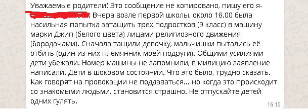 «В Благовещенске орудует педофил. Сегодня днем мои знакомые отбили ребенка, которого он пытался затащить в машину. Будьте внимательны, раскидайте по группам!» — в разных вариациях это сообщение также недавно курсировало по ватсапу, сея панику среди амурским мам. Официально факты не подтвердились. А выйти непосредственно на «знакомых» корреспондентам не удалось.