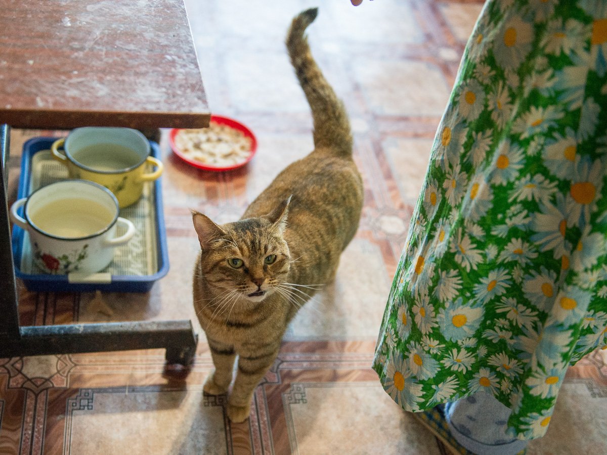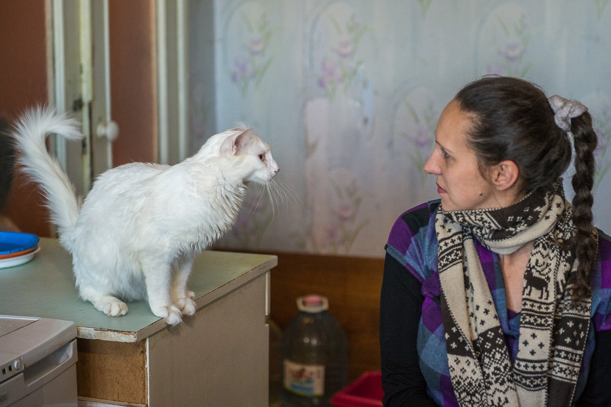 В квартиру на улице Нагорной Любовь Семеновна переехала двенадцать лет назад: после смерти своей мамы поменяла квартиру, чтобы находиться ближе к брату. Помимо чемоданов с вещами и коробками с посудой, в новую квартиру заехали и 11 кошек. Сейчас из них в живых осталось только две — Багира и Настя, остальные умерли от старости. Настеньке — серо-белой красавице — уже 17 лет, но она до сих пор ластится к хозяйке, требуя любви и внимания. «Она все пытается что-то сказать мне на ушко, а я не понимаю», — смеется баба Люба.