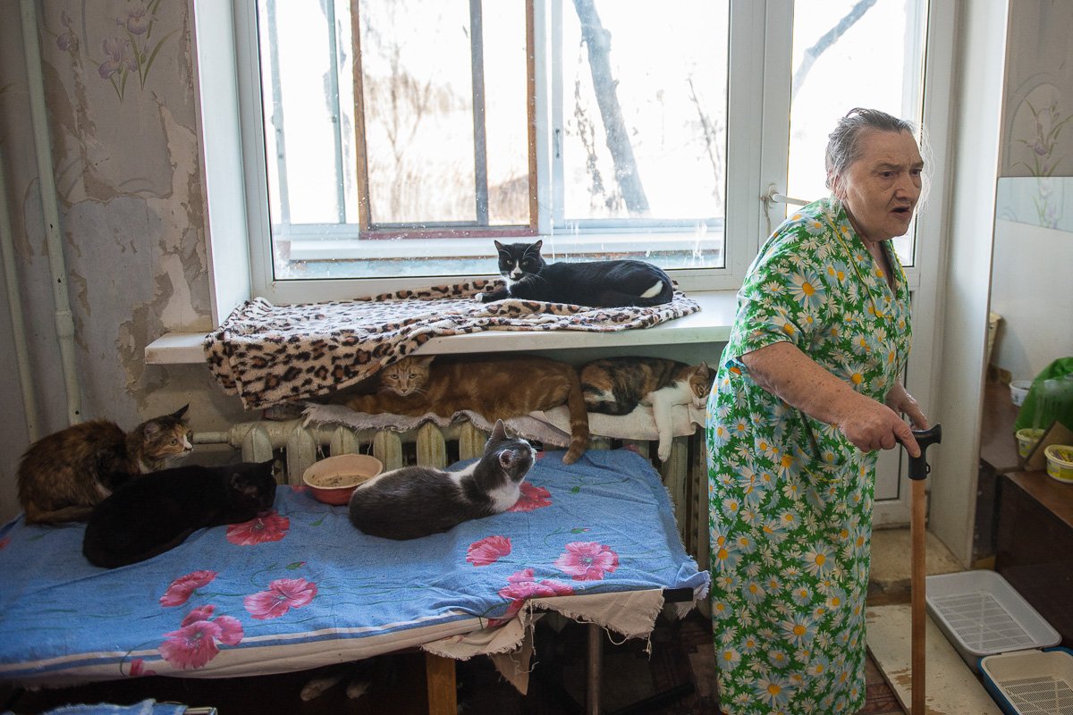 Всю жизнь пожилая благовещенка содержит животных за свой счет, но пенсии хватает только на двухнедельное пропитание. Несколько лет назад о ней узнали зоозащитники и стали помогать старушке: лечили и пристраивали животных, убирали в квартире, привозили корм и еду. Несмотря на то что у кошек постоянно стоит сухой корм, они с нетерпением ждут отдельного двухразового питания. А если выдача еды задерживается, то сидят под дверью и голосом напоминают о необходимом променаде.