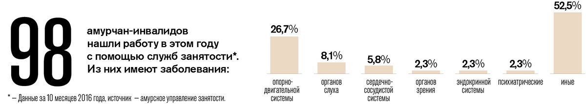За 10 месяцев этого года в поисках работы в службы занятости области пришли 733 человека с особенностями здоровья. Но работу с помощью специалистов нашла лишь седьмая часть обратившихся — 98 человек. Вместе с тем, по официальным данным, уровень безработицы среди инвалидов в области даже ниже, чем в среднем по региону, — 2 % против среднеобластного показателя 2,1 %. На учете в центрах занятости сейчас стоит 452 амурчанина, имеющих 1-ю, 2-ю или 3-ю группу инвалидности.