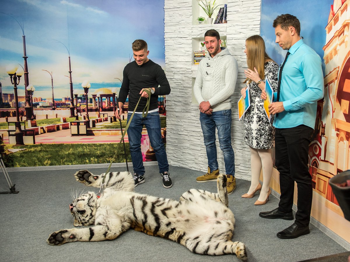 Магда пришла в студию со своим дрессировщиком Ростиславом Гаврыливым. По его словам, это просто уникальная тигрица — она очень социализированная и привыкшая к вниманию людей: с хищницей можно спокойно гулять по парку и ходить на мероприятия. Во время эфира Магда это доказала — вела себя как обычная домашняя кошка: спокойно лежала, играла с ботинком хозяина и нежилась на полу в студии.