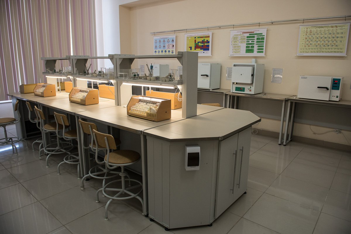 В химлаборатории есть все, что необходимо для производства: высокоточные весы, вытяжные шкафы для токсичных реагентов, термостаты, муфельная печь, колбочки и пробирки и многое другое.