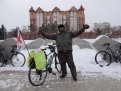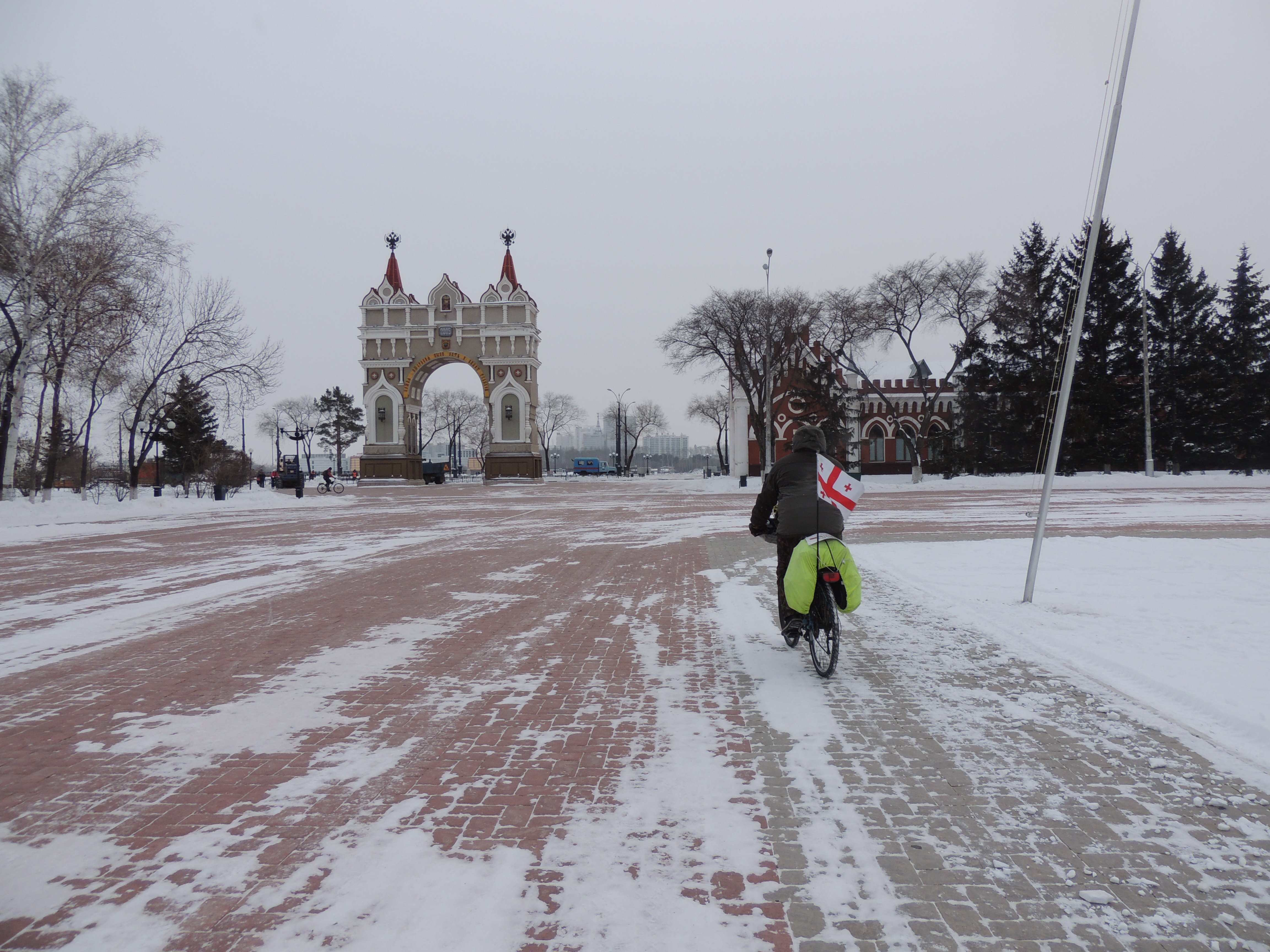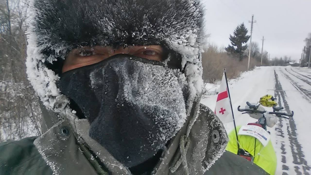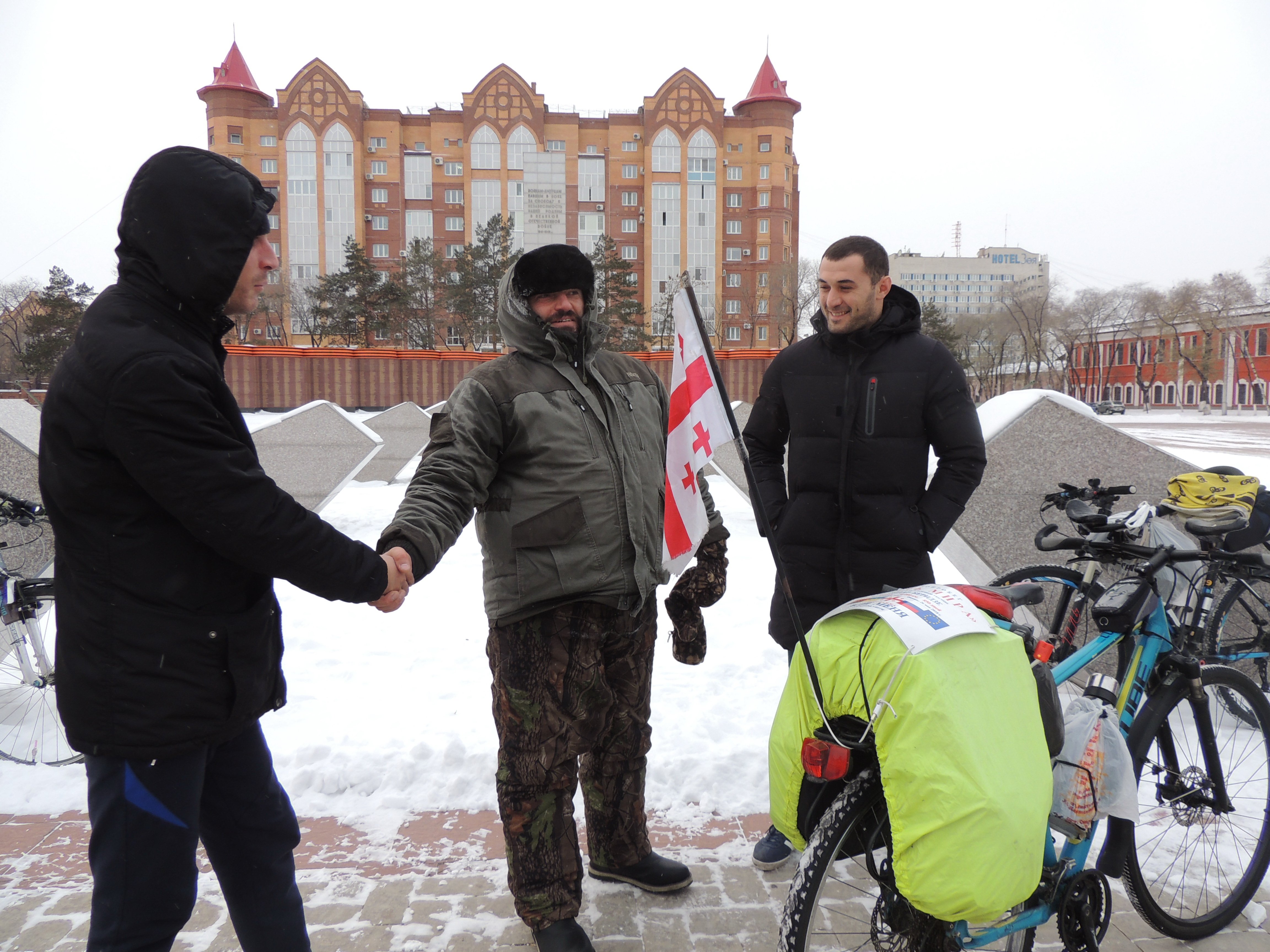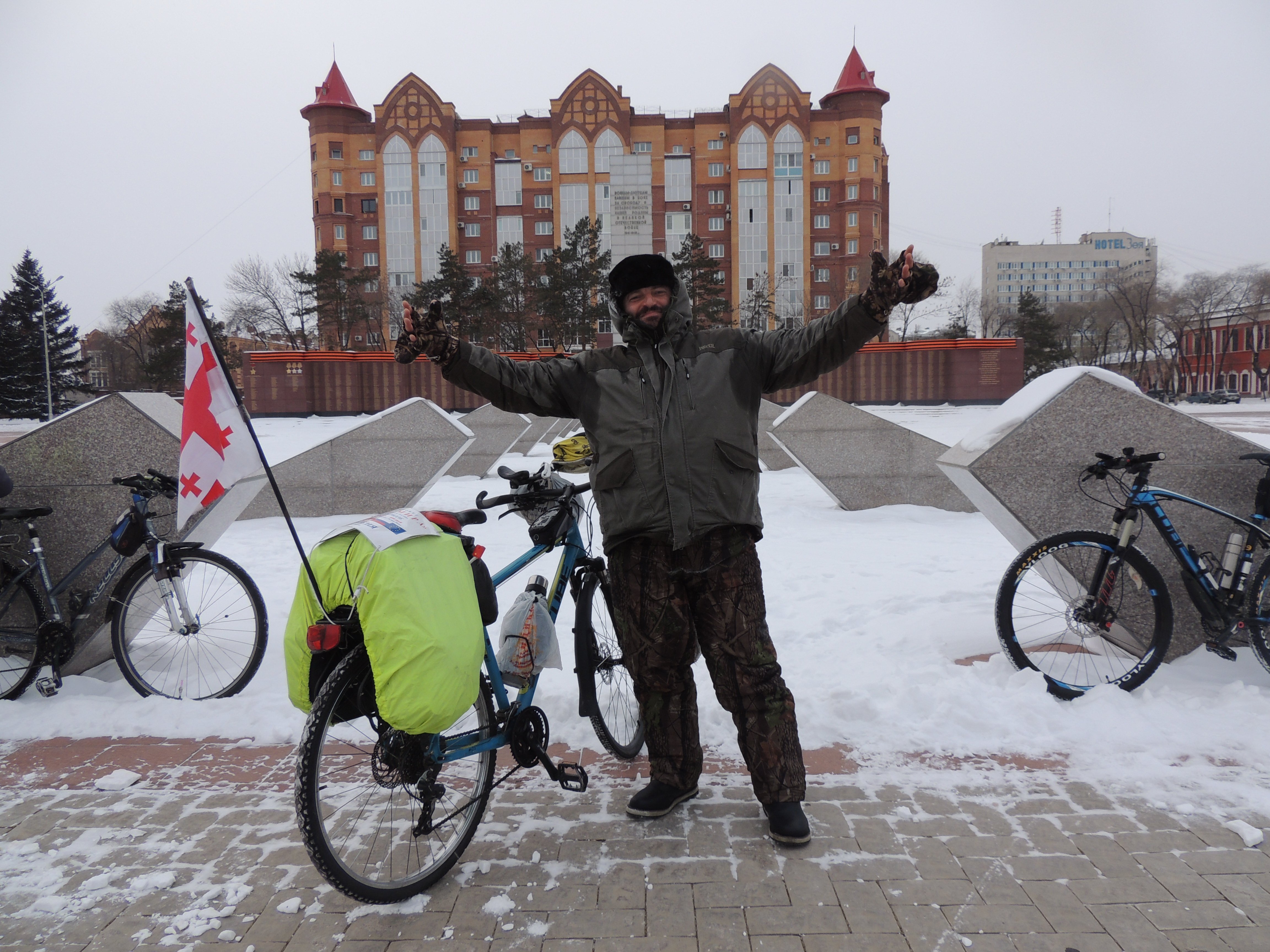 У зимней езды на велосипеде есть свои особенности. Мало того, что скользко и падений не избежать, так еще и быстро ехать нельзя, чтобы не вспотеть и не замерзнуть. А также калории зря не расходовать. На ночь Нодар останавливается в населенных пунктах. На дороге всякое случается. Так, во время метели амурские полицейские предлагали его подвести и хотели отдать теплую куртку. А вот на подходе к Благовещенску, когда путешественника сопровождали ребята из вело-туристического клуба «Два колеса», он, единственный из колонны, был остановлен сотрудниками госавтоиснпекции. «Говорят мне — вы, велосипедисты, наркотики провозите, — улыбается Ильич. — Хотели уже вещи досматривать, но грузинский флаг остановил. Он меня, кстати, не раз выручал. Вот один умник уже на вашей кольцевой транспортной развязке решил выразить свою ненависть к велосипеду, мол, мешаем мы ему, прижал меня к обочине. И тут флаг увидел.