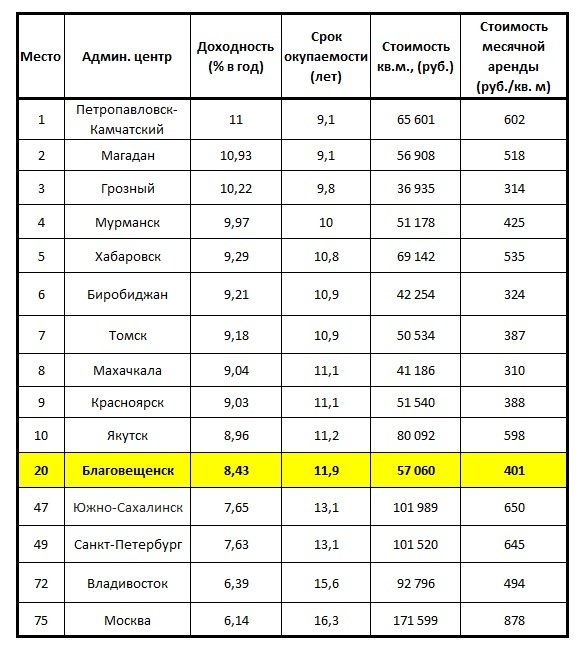 Областной центр Приамурья — Благовещенск — попал на 20-ю строчку рейтинга SRG. Доходность жилой недвижимости в амурской столице составляет 8,43 процента в год при средней стоимости «квадрата» в 57 тысяч рублей и средней величине арендной платы в 400 рублей за «квадрат». Окупаемость сдаваемой в аренду квартиры в Благовещенске составляет 11,9 лет.