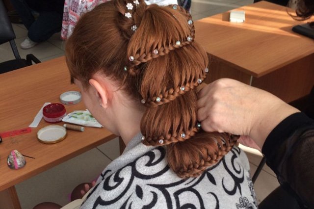 — Есть не очень приятные моменты для модели в самом начале, когда мы втыкаем шпильки, на которых и держится прическа, но потом все нормально, — пояснила опытная мама. — А вообще соорудить что-то интересное и необычное — не проблема. На трех дочках натренировалась. Старшая по утрам сейчас уже сама заплетается, а я делаю прически средней и младшей. Минут двадцать на все уходит — рука набитая.