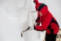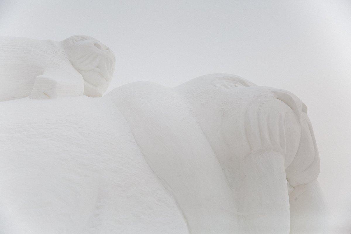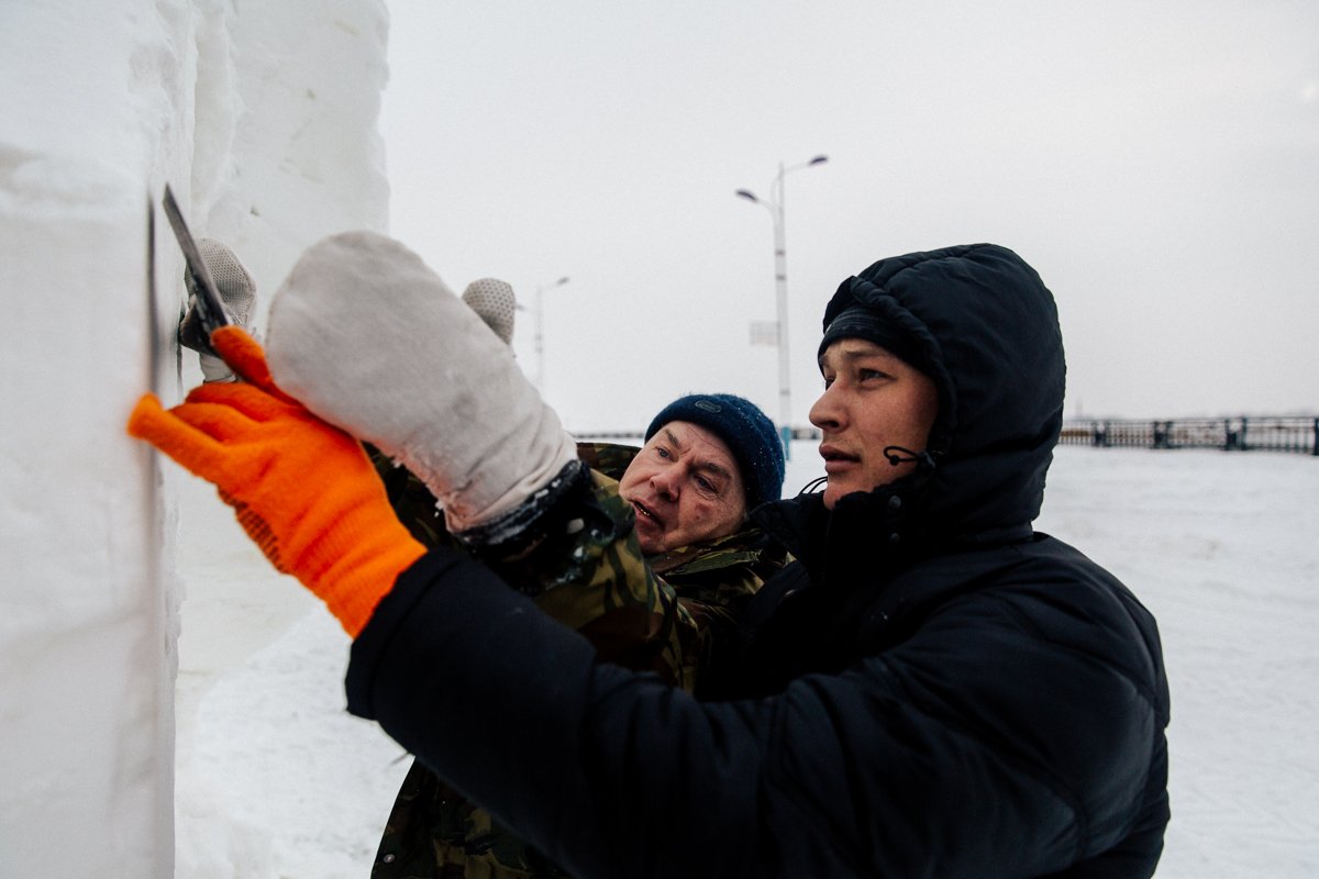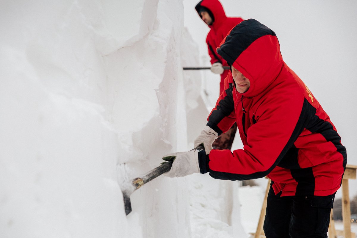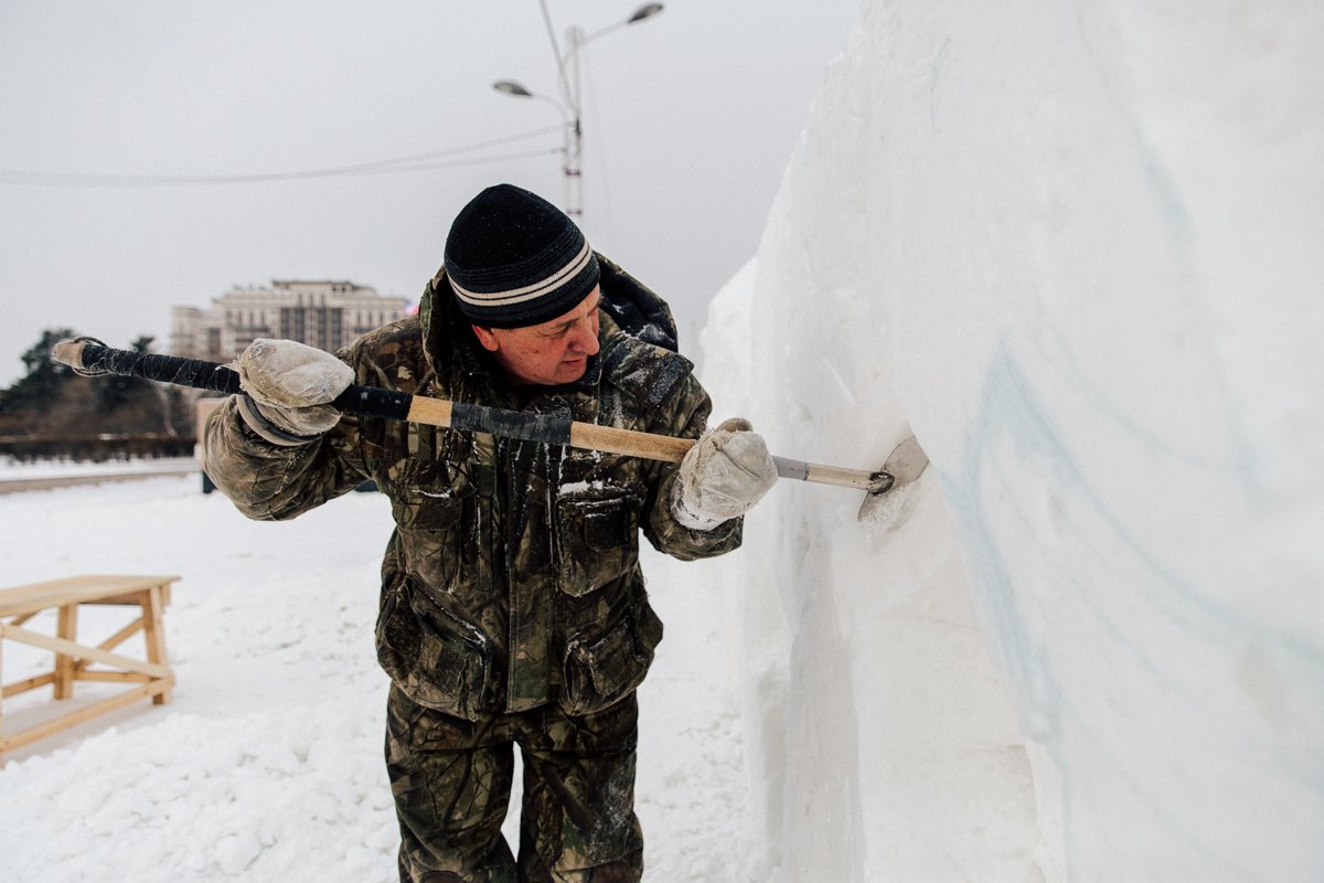 Каждая будущая фигура — это бывший большой кусок снега, который несколько дней слеживается в деревянном коробе. Затем каркас убирают, и художник начинает ваять: обрубает лишнее, подгоняя под будущую композицию. Затем обязательно делает разметку и замеряет расстояние между несколькими точками скульптуры. Если этого не сделать, то фигура может уехать в сторону или вовсе не получиться. На изготовление одного персонажа уходит от одного до двух дней.
