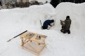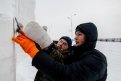 Алексей Сидоров — главный в строящемся городке. По профессии пожарный, а в душе — художник и скульптор. Без его участия вот уже 11 лет не появляется ни один снежный городок в Благовещенске. « Первые две фигуры сделал я, но они, если присмотреться, отличаются друг от друга качеством снега. Морж сделан из нормального снега, видно даже сейчас что он чисто белый. Он появился за половину дня, а мишку уже делал из плохого, мокрого, снега с темными пятнами. Его и сложнее обрабатывать было, и времени на него ушло в два раза больше».