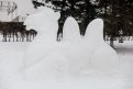 — Фигура очень сложная из-за таких деталей, как клыки, уши, силуэт человека, — рассказал хабаровский мастер. — Время теряется и из-за плохого снега. Он твердый, с кусками льда. Это из-за теплой погоды снег не имеет необходимой рыхлости, он подтаивает и затем при минусе смораживается. Таким его сложно обрабатывать, приходится брать бензопилу, а стамеску для прорисовки деталей — точить спустя пару-тройку часов.