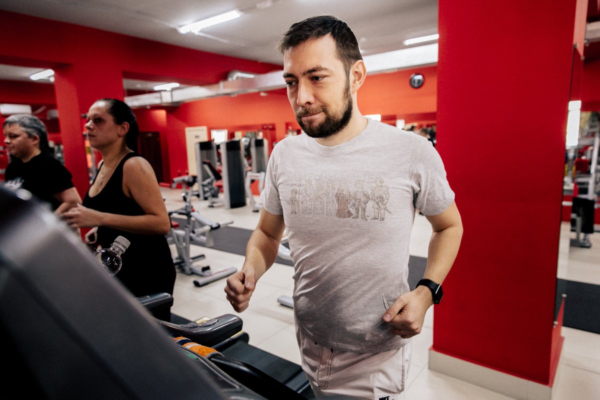 И вот она — первая тренировка. Первым делом 40 минут на беговой дорожке, к счастью, не бегом, а быстрым шагом — 7 километров в час. Но уже после десяти минут активной ходьбы понимаешь, что сидячий образ жизни наложил свой черный отпечаток. А впереди еще полчаса.