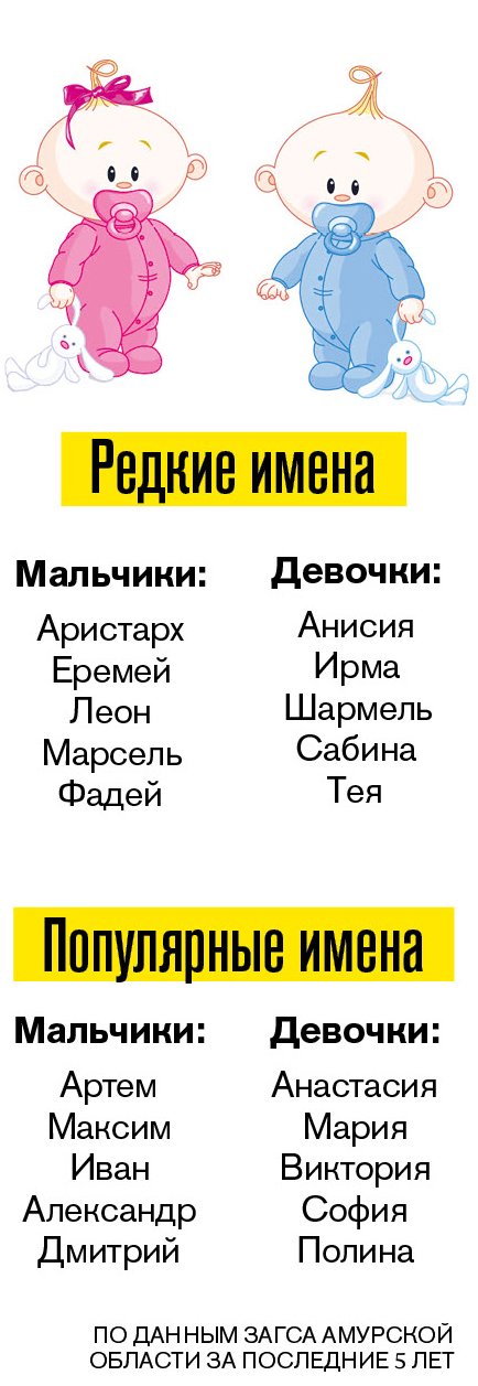 — Меня не удивляет стремление людей к оригинальности, это естественное желание выделиться, — говорит Анжелика Ращупкина. — Вспомните 30‑е годы прошлого века — детей называли Сталинами и Тракторинами. Кстати, мое имя тоже было большой редкостью, когда я родилась, была популярна Анжелина Дэвис. Кстати, мода на знаменитостей есть, помню, когда на пике популярности была певица Валерия, у нас девочек стали называть этим именем. В топ редких попали и вполне обычные имена. Например, из около 4000 детей в Благовещенске всего 10 носили имя Татьяна — недавно мы интересовались этим вопросом, когда готовились к Татьяниному дню. Практически не называют девочек Галями, Ирами, Людмилами и Натальями. Кто знает — через время, вполне возможно, они снова станут популярными.