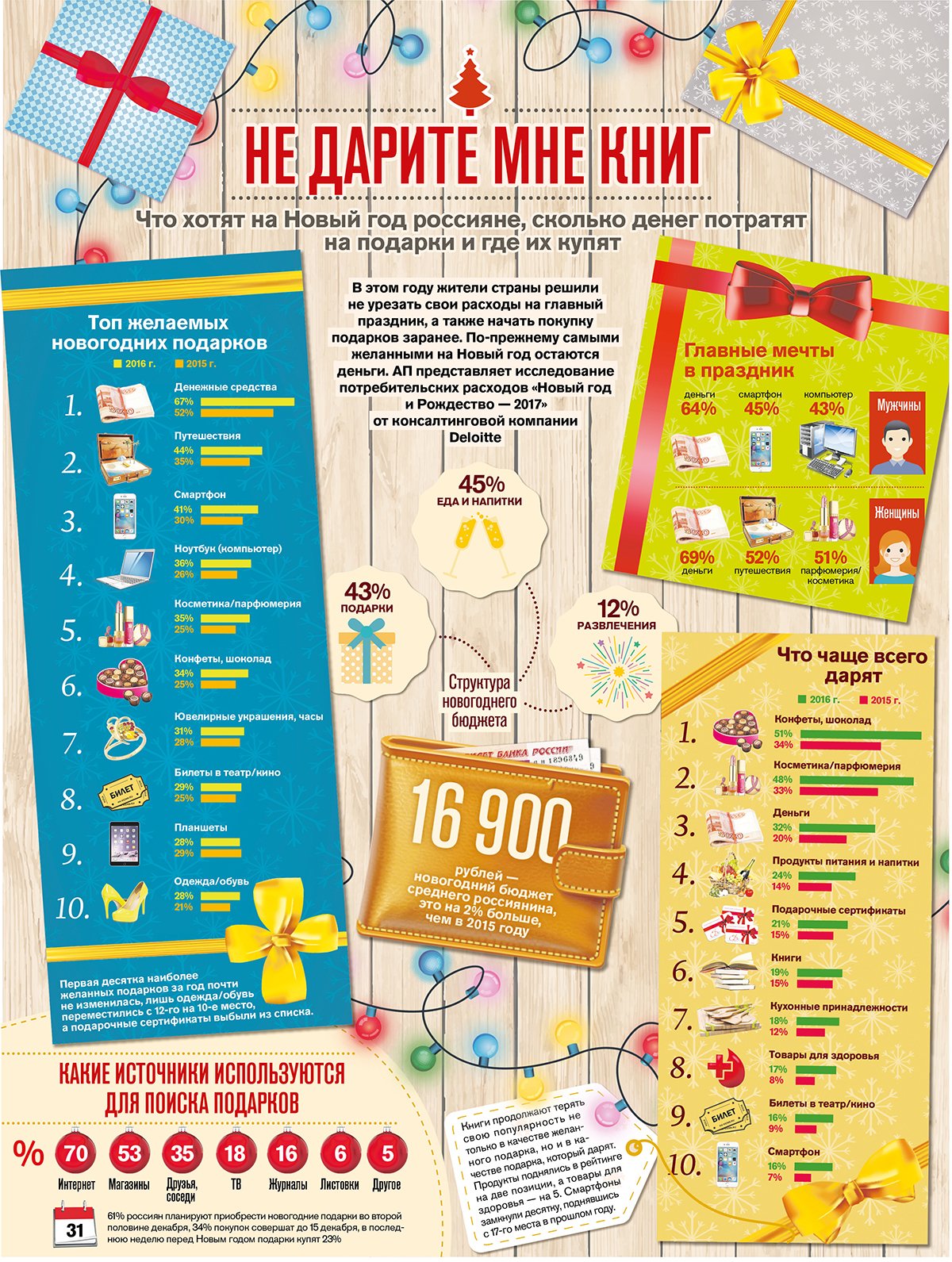 «Старшая дочь Лида хочет увидеть под елкой смартфон последней модели, но так как наш семейный бюджет не потянет, мы с мужем решили подарить ей деньги, чтобы она могла подкопить и осуществить свою мечту», — говорит директор по персоналу крупной торговой компании Анна Петрова, сама мечтающая о вечере в Париже. Получить в подарок гаджет последней модели или модные к нему примочки — желание практически всех подростков. Это подтверждают в городских гипермаркетах электроники. Тем более что в этом году торговые линейки пополнились новинками. «Простенькие телефоны и планшеты обойдутся в сумму три-пять тысяч рублей, но есть и по 100—150 тысяч — из последнего поколения. Эти гаждеты в декабре смещены с первой строчки рейтинга покупательского спроса игровыми приставками. Вышла PS 4, к ней можно приобрести даже электронную гитару. Такой подарок стоимостью порядка 30 тысяч рублей выбирают как дети, так и взрослые, — рассказали в одном из салонов цифровой электроники. — Еще одной новинкой цифровой индустрии стали очки виртуальной реальности. Цена варьируется от восьми до тридцати тысяч».