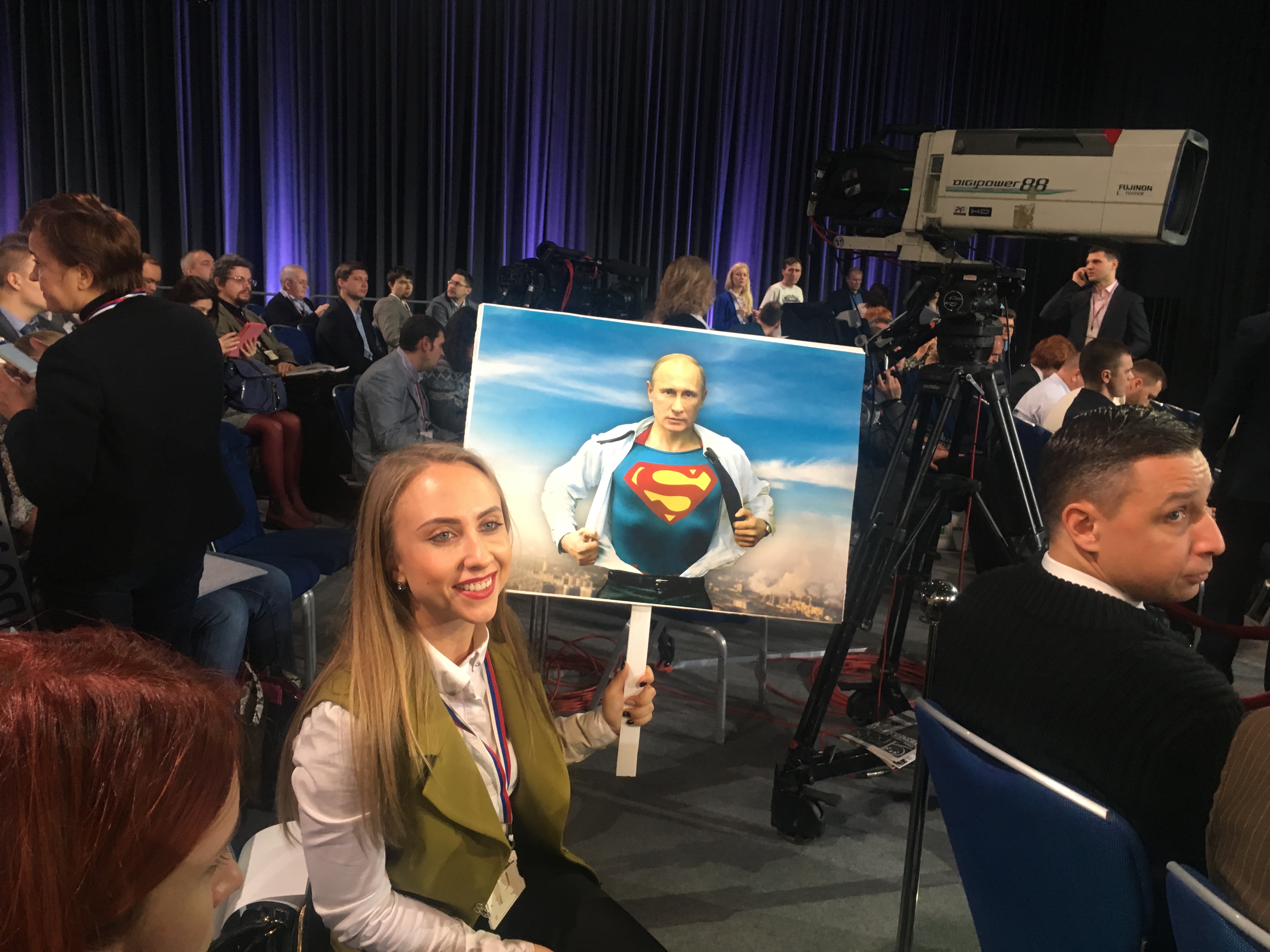 — Для всего нашего женского коллектива президент — супергерой! — весело раздавала интервью коллегам блондинка с картонным бюстом Владимира Путина в костюме Спайдермена.