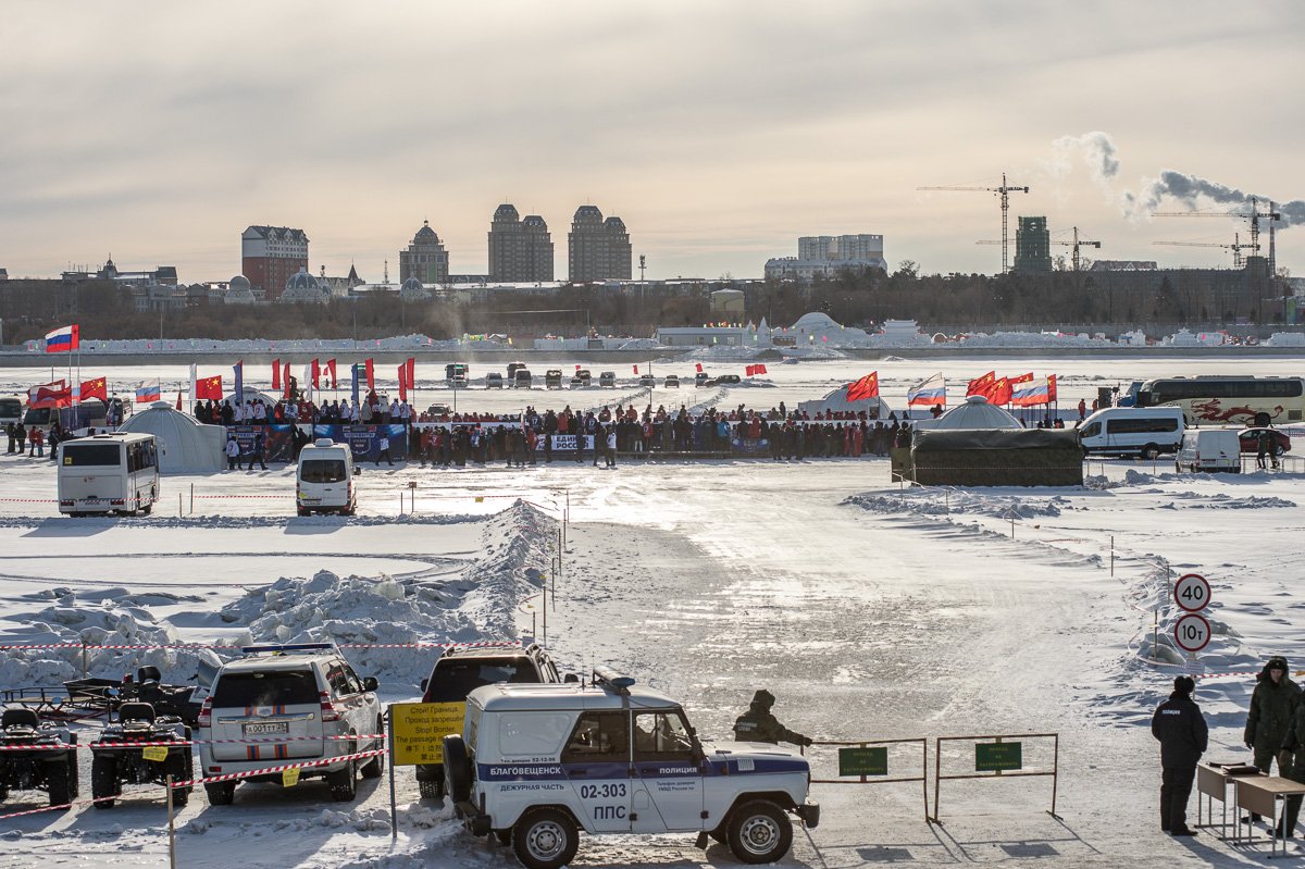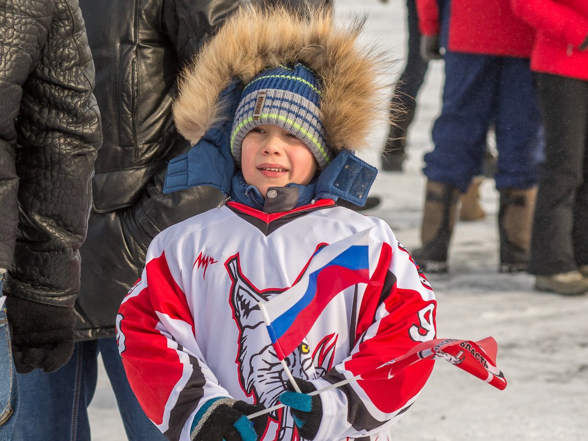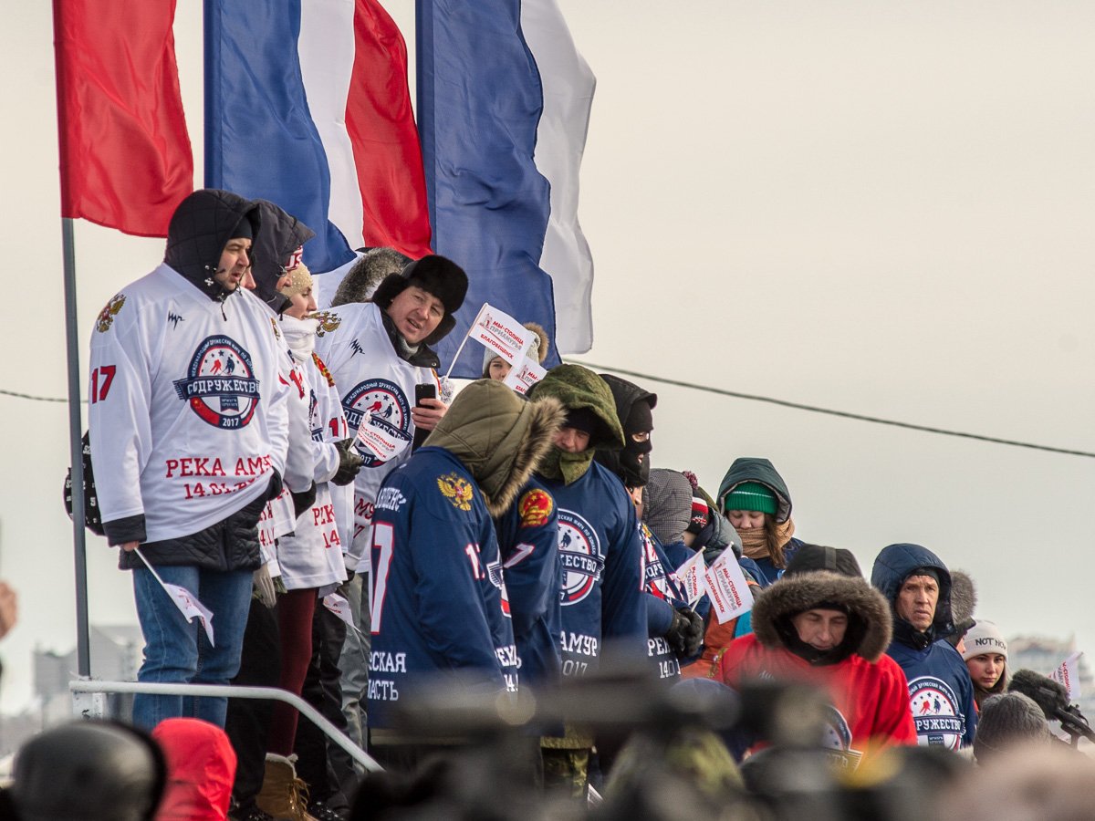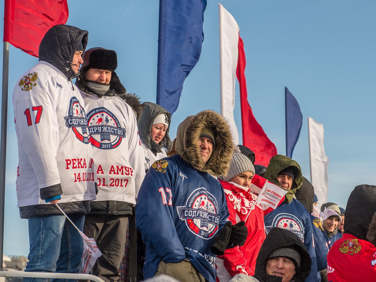 Торжественная церемония открытия дружеских встреч между детскими и взрослыми командами России и Китая началась в полдень. К этому времени у хоккейной коробки, которая расположилась посреди государственной границы непосредственно на реке собралось около 400 болельщиков обеих стран.