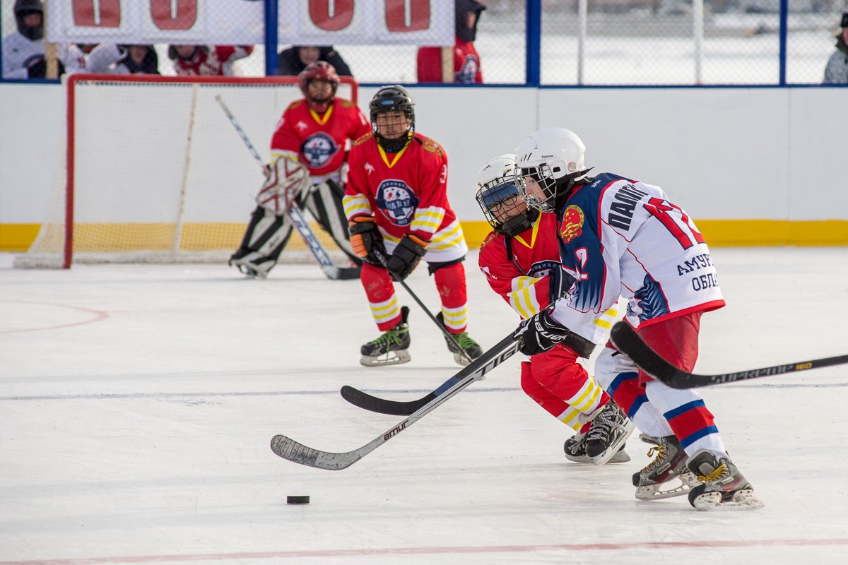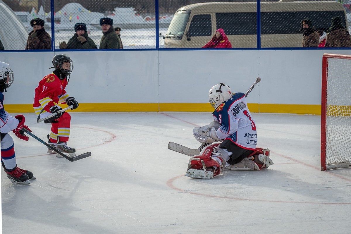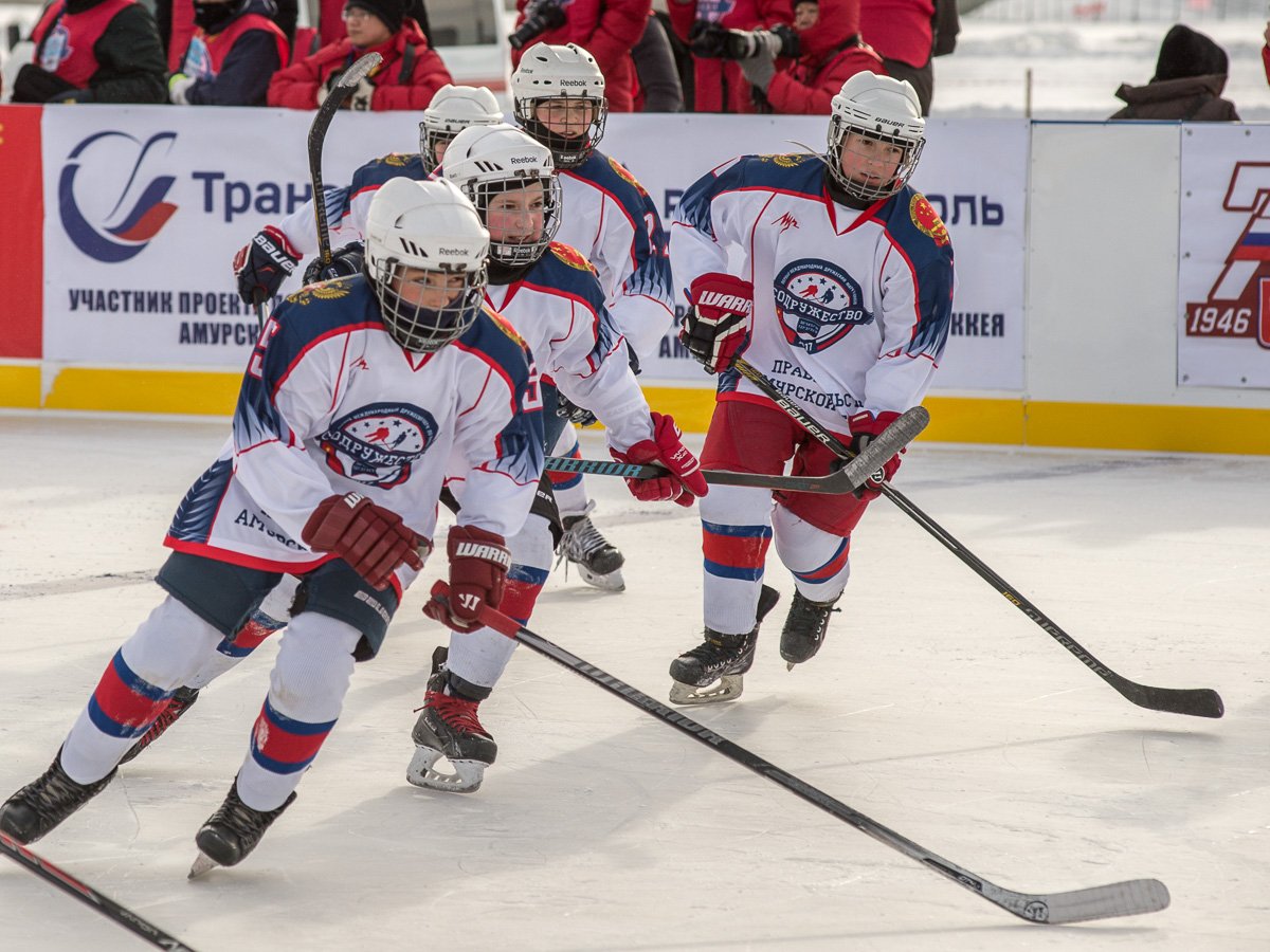 Первыми на лед вышли ребята 10— 11 лет. На поле они провели всего 10 минут, но этого времени хватило, чтобы показать зрелищную игру. Российская команда «Форвард» состояла из воспитанников детско-юношеской школы № 3. Вместе с мальчишками на лед вышла и единственная в Амурской области девочка-хоккеист Александра Нестерова.