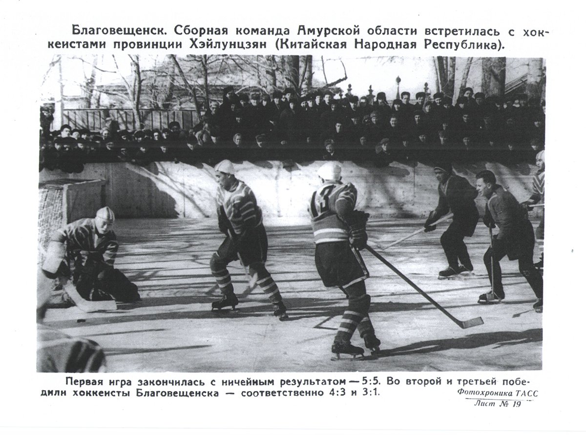 Впервые международные матчи на территории двух соседних городов — Благовещенске и Хэйхэ состоялись в марте 1958 года. Первая игра закончилась ничейным счетом — 5:5. Во второй и третьей победили благовещенцы. Все три дня трибуны стадиона «Динамо» (ныне «Спартак») были переполнены. Состав команды гостей был сформирован в основном из игроков Харбина: рабочих и служащих предприятий и учреждений, студентов и школьников. В музее истории амурского спорта при Благовещенском спорткомитете был найден вымпел с бахромой, подаренный китайской делегацией. На нем — шелковые иероглифы и дата «1958».