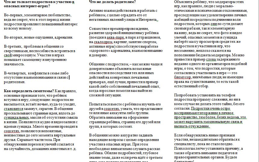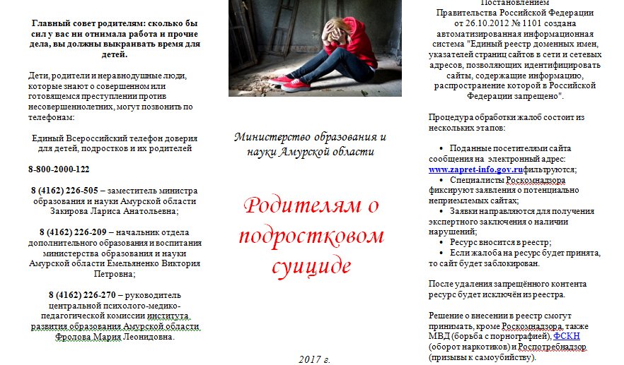 «Сейчас по всем школам области будет усилена работа по информированию детей и родителей об опасных группах. На родительские собрания будут приглашаться специалисты, которые объяснят, как можно проконтролировать действия детей в интернете. К слову, по этому вопросу мы даже подготовили специальную памятку, — отметила министр образования и науки области Марина Селюч. — Необходимо менять методы и формы воспитательной деятельности, работать точечно и индивидуально, причем не только с каждым ребенком, но и его родителями».
