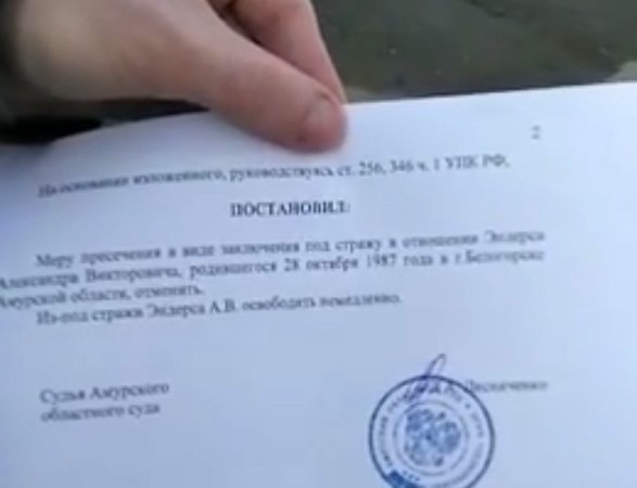 Фрагмент с видеозапесиНа выходе из здания суда Александра Эндерса уже караулили амурские журналисты. Им он показал постановление об освобождении из-под стражи.