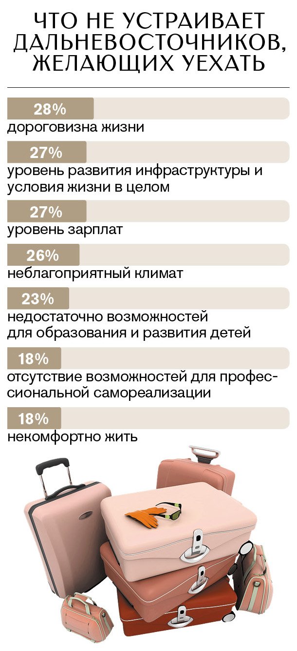 Как отмечают представители ВЦИОМ, миграционный отток населения — одна из самых существенных проблем Дальнего Востока. Так, судя по опросу, больше половины молодых и образованных людей от 18 до 35 лет не хотят связывать свою жизнь с родным регионом. Самые популярные причины, толкающие людей на переезд: дороговизна жизни, низкий уровень развития инфраструктуры и условия для жизни в целом, уровень зарплат, неблагоприятный климат и недостаточно условий для образования и развития детей.