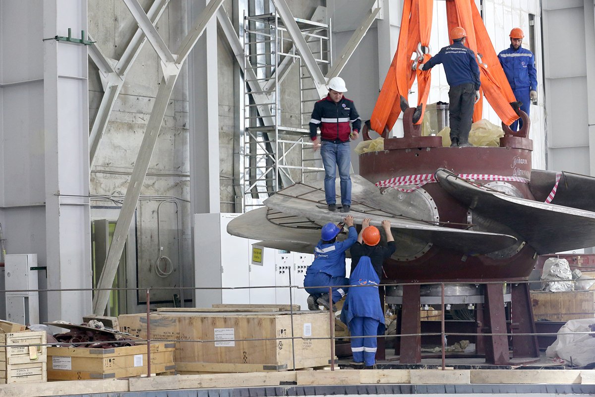 Рабочее колесо турбины помещают в кратер гидроагрегата № 4. В сборе оно имеет диаметр 6,3 метра и вес 96 тонн. Самая же массивная деталь агрегата ротор — 320 тонн.