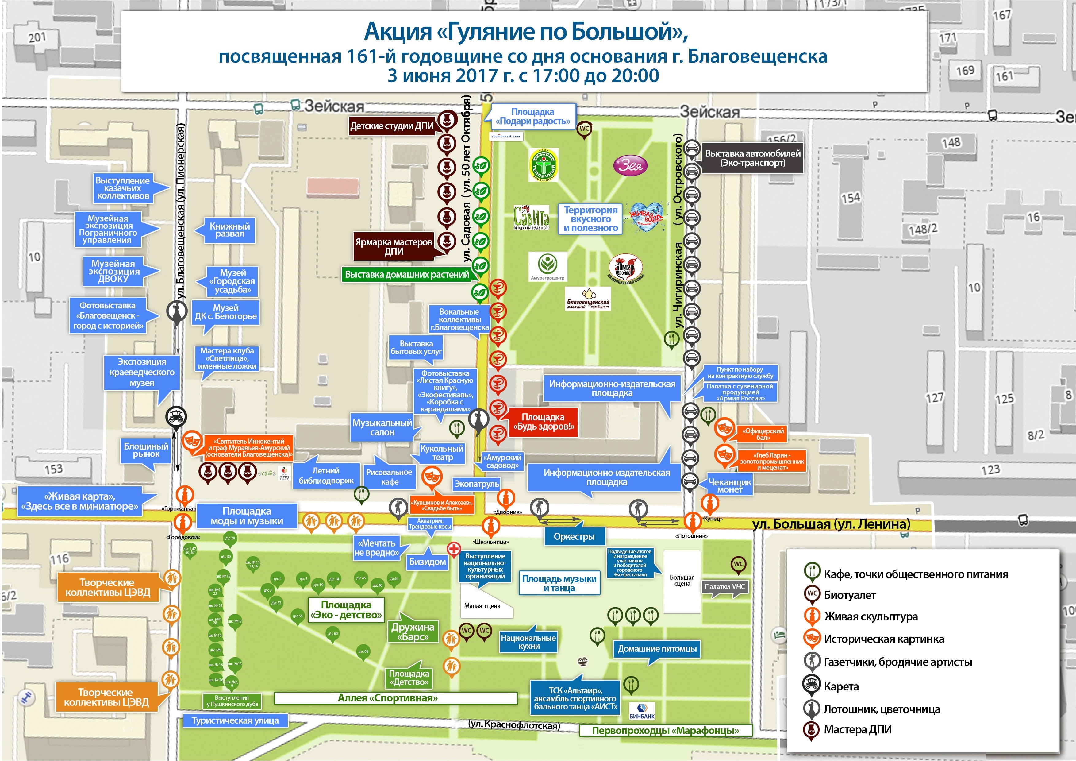 17:00—20:00 — (ул. Ленина — участки улиц Пионерской, 50-летия Октября и Островского на протяжении от ул. Краснофлотской до Зейской). Масштабное «Гулянье на Большой».