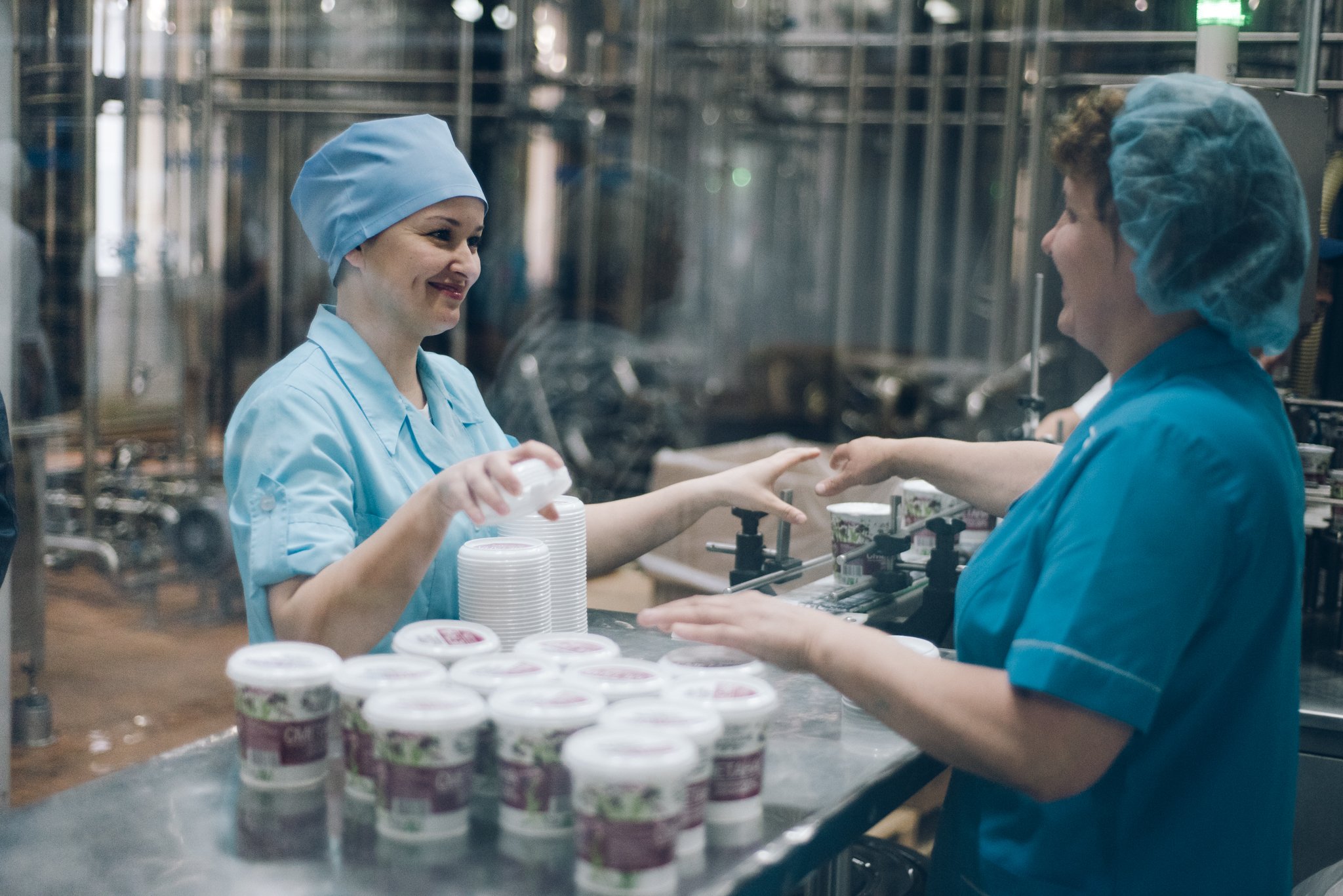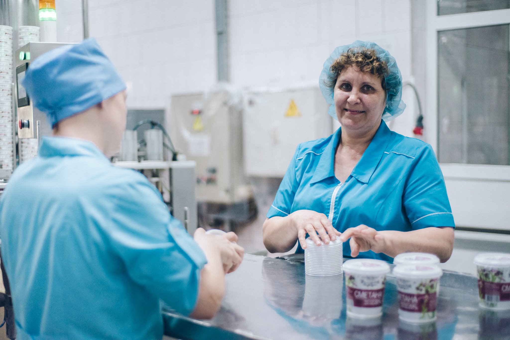 В огромном цеху ровными рядами движутся упаковки с готовым молоком, варенцом, ряженкой. При этом в зале находятся только 2—3 сотрудника, они контролируют работу у компьютеров. Стоять на конвейере не нужно: автоматика абсолютно самодостаточна и в случае сбоя настроек или неполадок тут же дает знать.
