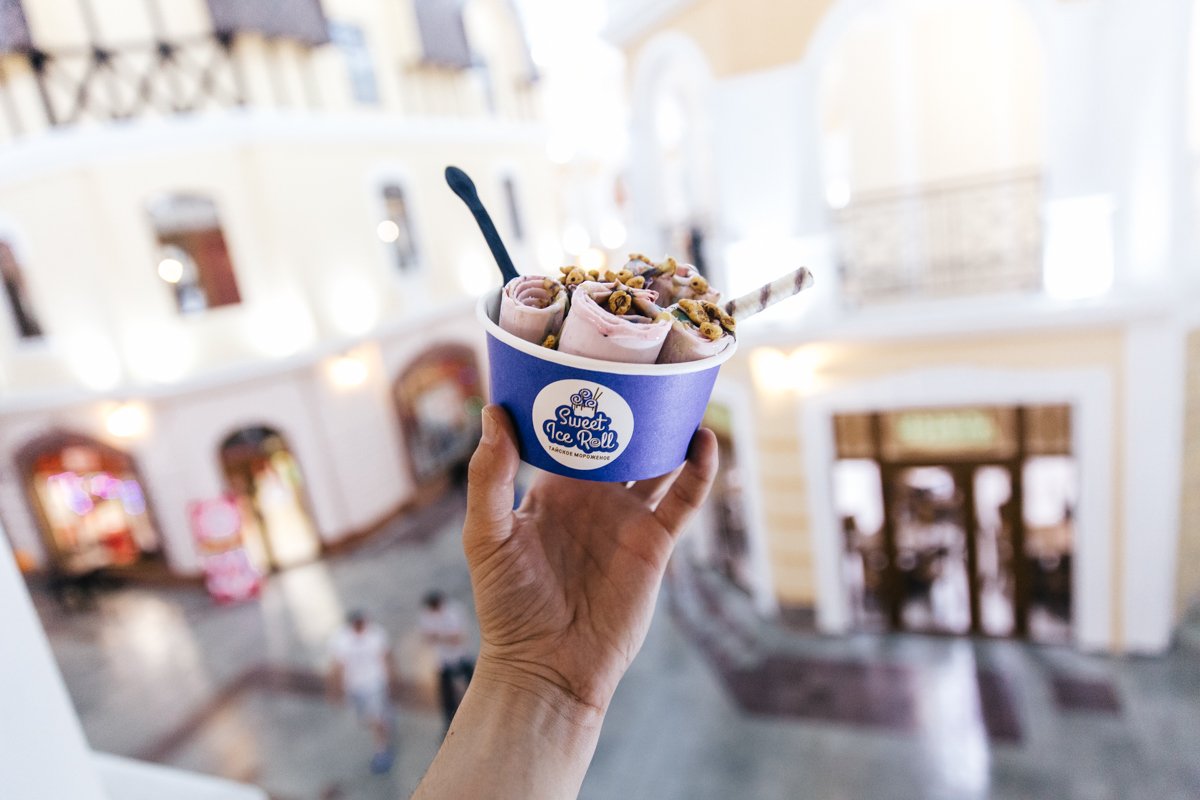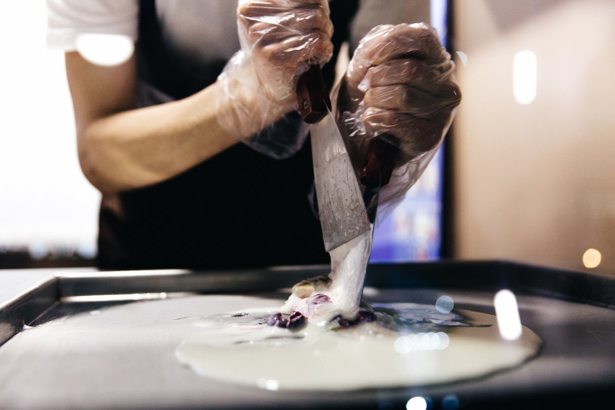 Делается тайское мороженое на глазах покупателя — это своеобразное представление, добавляющее ценности продукту. Клиент выбирает вид мороженого и начинку. Кондитер-продавец растирает ингредиенты в тонкий блин на сковородке-холодильнике, а затем специальным скребком собирает его в роллы.