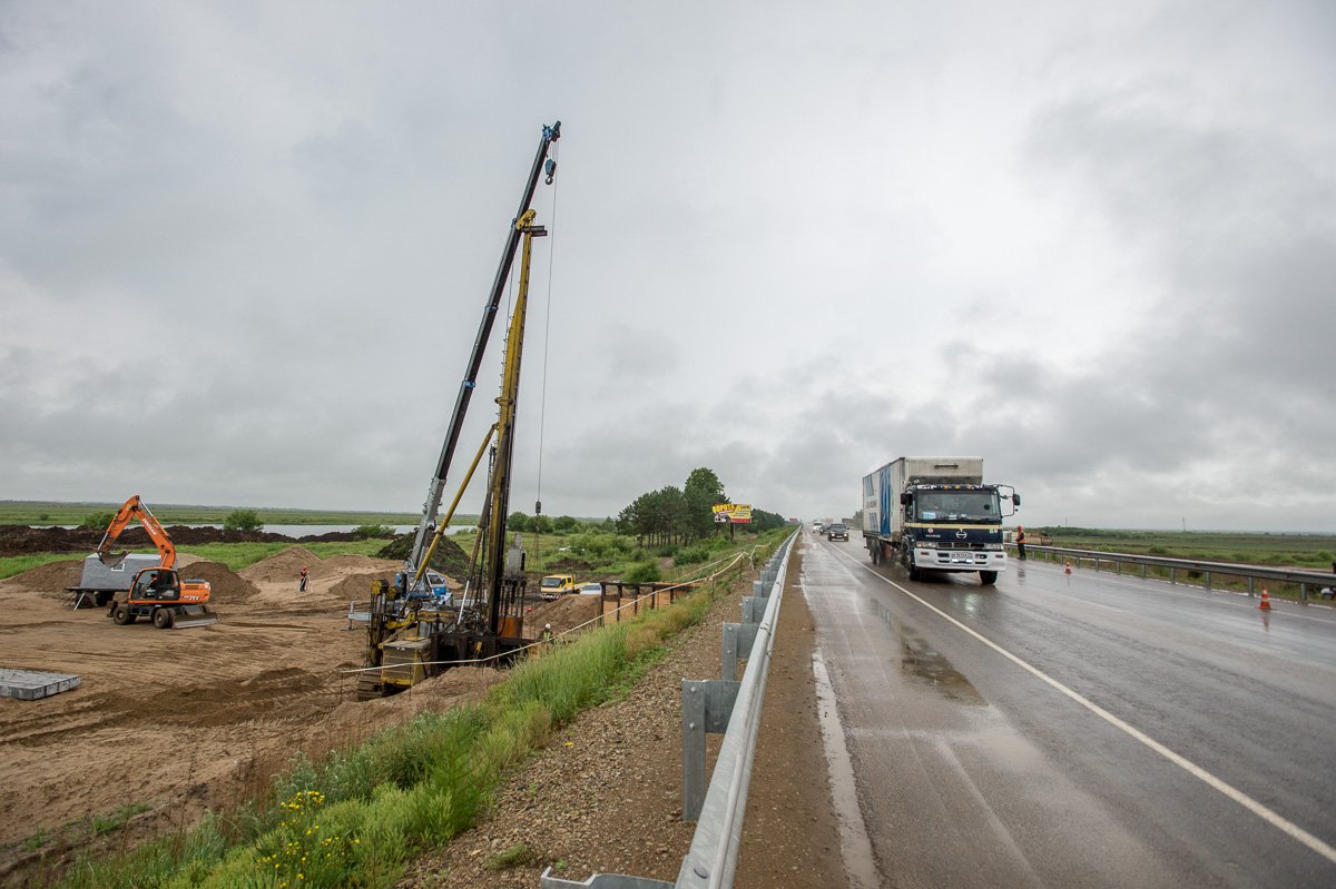 Еще один законченный объект сразу за постом — технологический мост через протоку Каникурганскую длиной 278 метров. Это временная переправа, необходимая для строителей. Рядом будет строиться постоянный мост.