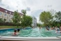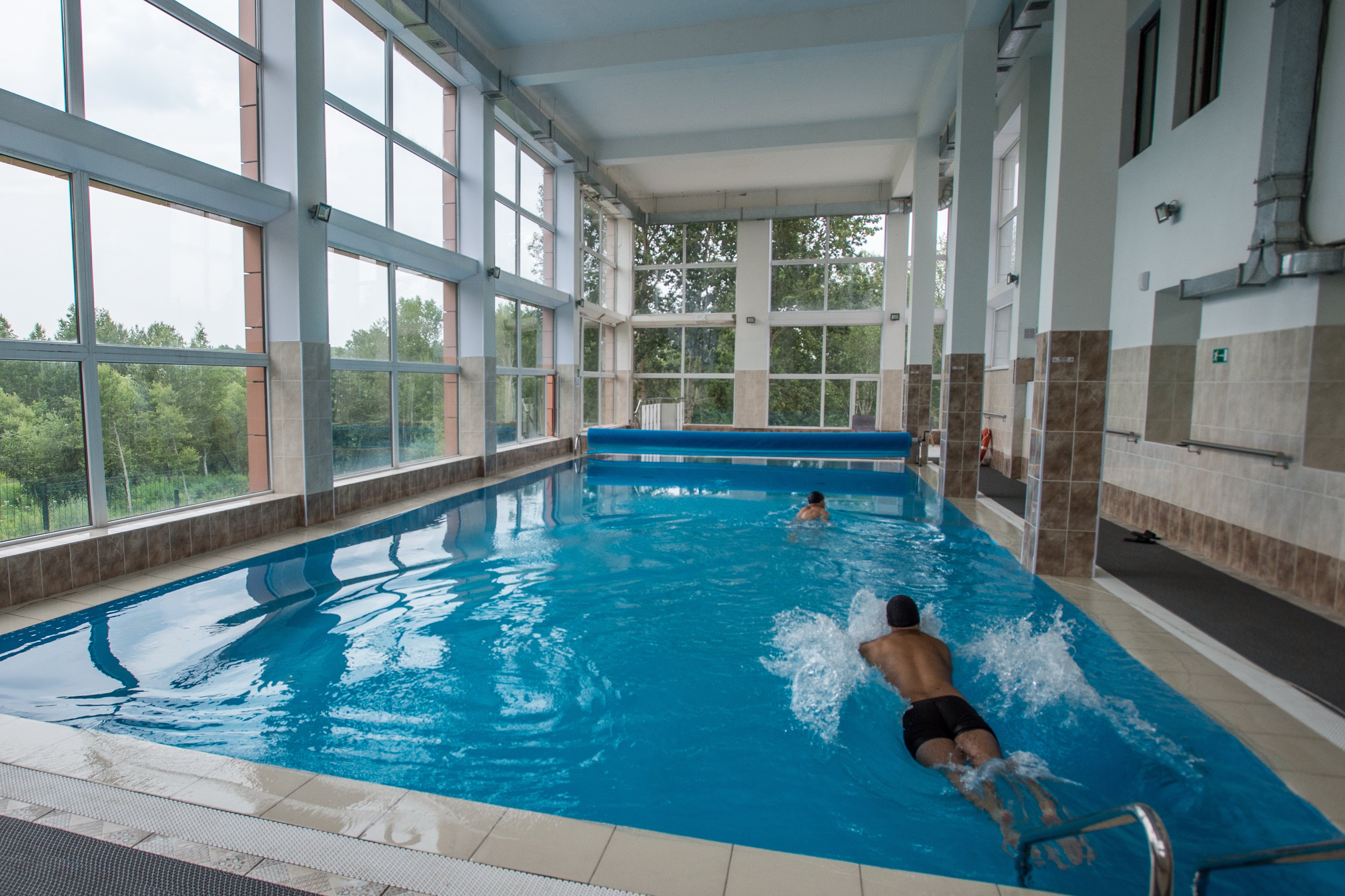 Поддать жару можно здесь же. В главном корпусе располагается гордость семейного пансионата — водный комплекс. К услугам отдыхающих три бассейна. Взрослый длиною 16 метров, детский бассейн с теплой водой и зона джакузи. В бассейне с джакузи бьют гидромассажные ключи и водопады. Помимо водного, можно сделать и обычный массаж. Также здесь есть хамам — турецкая баня с тремя температурными режимами, финская сауна и русская парная. Все это делает «Берлогу» базой круглогодичного отдыха. Согласитесь, прекрасно плавать в большом бассейне, когда за окнами лежит снег. Причем окна в этом помещении просто огромные. Вода прогревается даже от солнышка. Создается такое впечатление, что ты плаваешь на улице. А отдыхающие с ночным пребыванием могут пользоваться водным центром бесплатно.