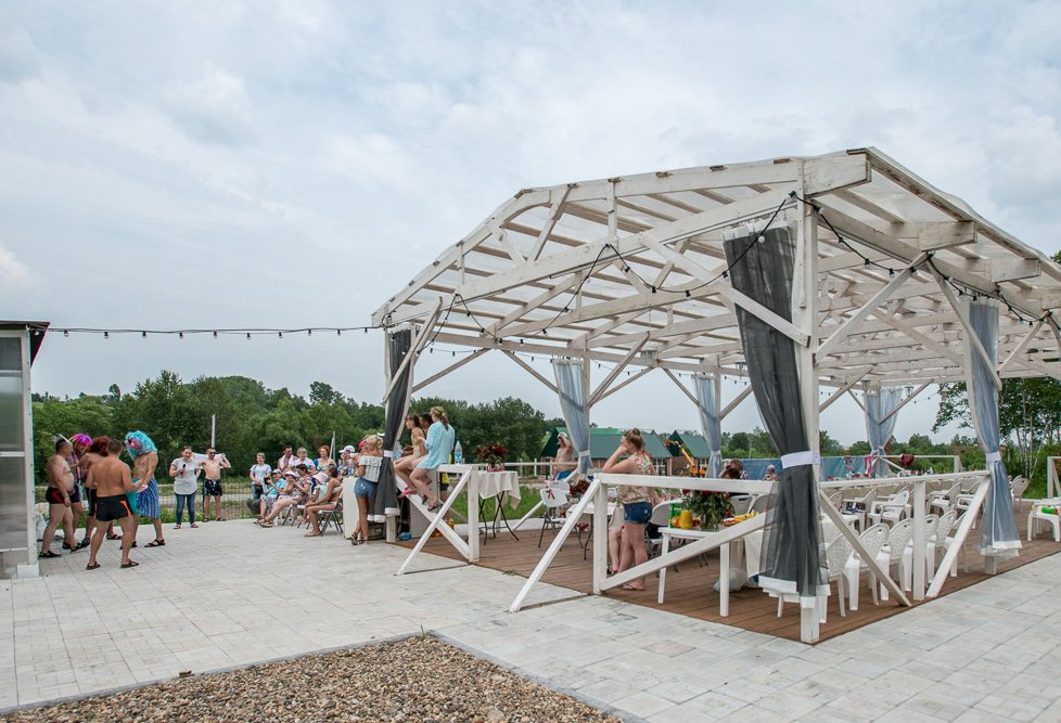 В минувшую субботу, 8 июля, в День любви, семьи и верности, в «Берлоге» разом гуляли четыре свадьбы — не пересекаясь друг с другом. Для этого торжества здесь есть белоснежная свадебная беседка, где можно не только провести торжественную часть, но и банкет. Она открыта и продуваема, в жаркий день здесь комфортно. Свадебная беседка оснащена специальными шторами, закрывающими от дождя, и москитными сетками. Беседка находится в живописной березовой роще, что добавляет романтики. Есть и свадебная арка, которая украшается живыми цветами. Еще один зал для торжеств, с выходом на улицу, располагается в главном корпусе. Кстати, находящиеся в этом же здании президентский и ВИП-номера пользуются большим успехом у новобрачных.