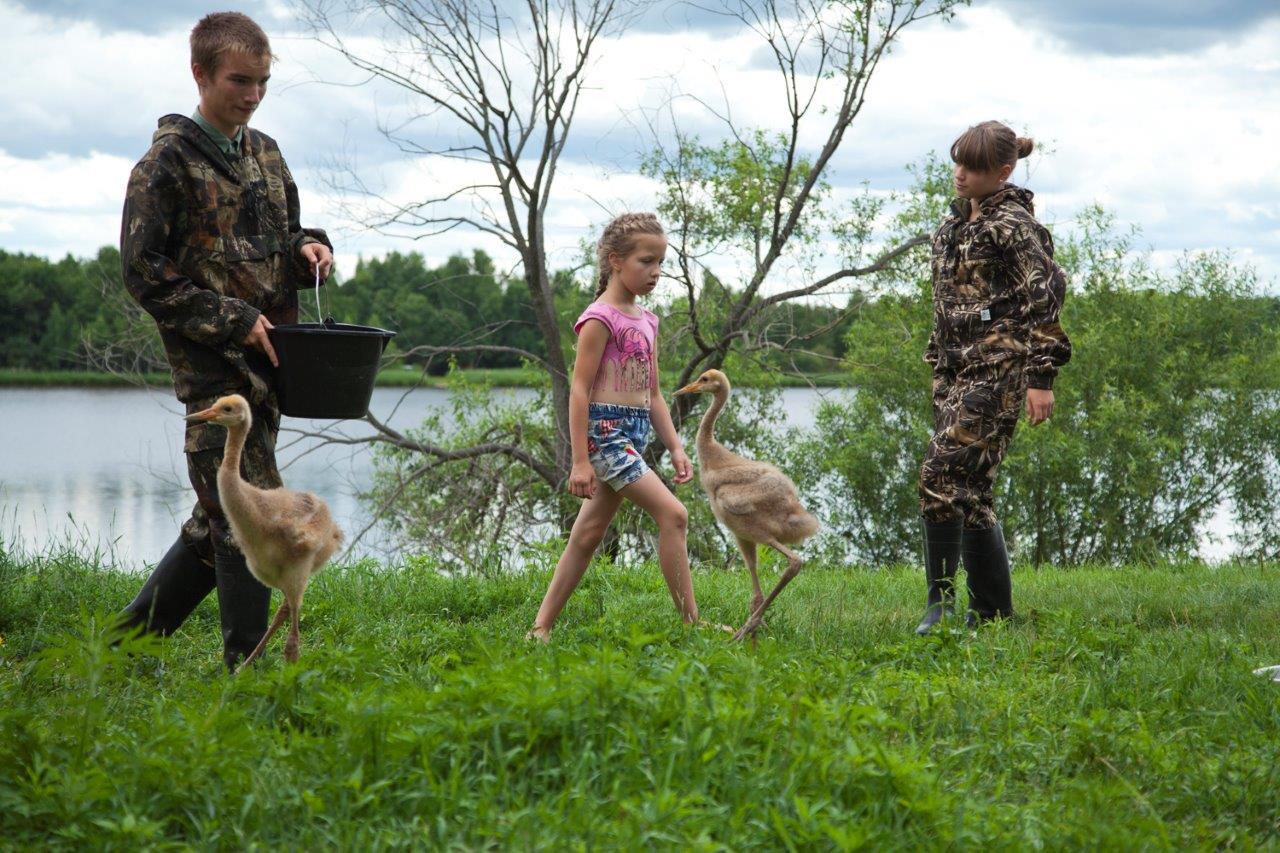 Летом у журавлиных «нянь» появляются другие подопечные — воспитанники Новобурейской коррекционной школы-интерната N5 и Новорайчихинского центра «Маяк», где выпускники детдома проходят адаптацию. Это подшефные учреждения Бурейской ГЭС. В целом здесь с середины июня побывали 16 ребят. В экосмену берут по 4 человека, гостят дети лишь неделю — пока птенцы маленькие. Краснокнижники не должны привыкать к человеку, иначе, повзрослев, не улетят. А пока же журавлята, как все детки, очень любопытные и не боятся людей.