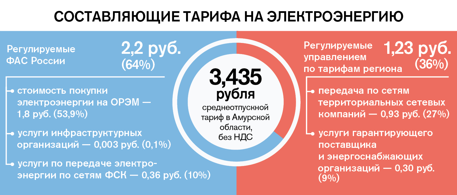 В киловатт входит множество составляющих: затраты энергокомпаний на выработку электроэнергии, ее приобретение и транспортировку, диспетчерское управление энергосистемой и сбыт. Формирование тарифов происходит как на федеральном, так и на региональном уровне. Стоимость электроэнергии на оптовом рынке, расходы по передаче энергии по сетям Федеральной сетевой компании, а также услуги инфраструктурных организаций (Системного оператора, коммерческого оператора — организатора торговли) утверждаются Федеральной антимонопольной службой России (ФАС России). Остальные составляющие тарифа устанавливает управление госрегулирования цен и тарифов Амурской области.