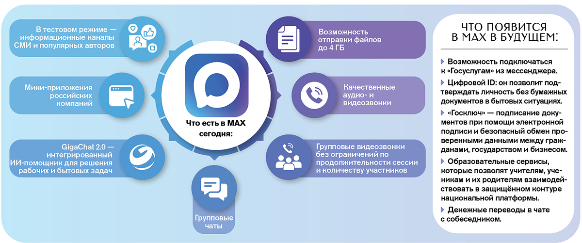 Конечно, работа над приложением еще идет. Но уже сейчас, помимо сообщений и групповых чатов, на платформе доступны качественные аудио- и видеозвонки, групповые видеозвонки без ограничений по продолжительности сессии и количеству участников. Также можно совершать денежные переводы без комиссии через систему быстрых платежей напрямую в мессенджере, для этого не нужно отдельно открывать банковские приложения. Кстати, сегодня у меня будет созвон с федеральными специалистами с помощью платформы МАХ, тема — внедрение МАХ. (Смеется.) Как видите, не только декларируем, но и сами активно используем. А ведь это тоже показатель.