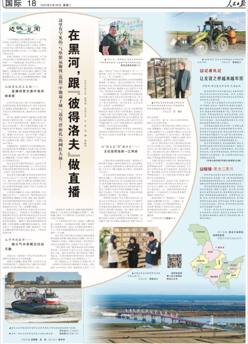 «Всего 5 минут — и ты в России», китайский блогер Петров, танцы на набережной и общие праздники на берегах Амура: главная газета Китая «Жэньминь жибао» опубликовала развернутый материал о жизни приграничных городов Хэйхэ и Благовещенска. Для китайских читателей эта публикация особенно значима — газета с тиражом более 3 миллионов экземпляров является официальным печатным органом Центрального комитета Коммунистической партии КНР и одним из самых влиятельных изданий в стране.