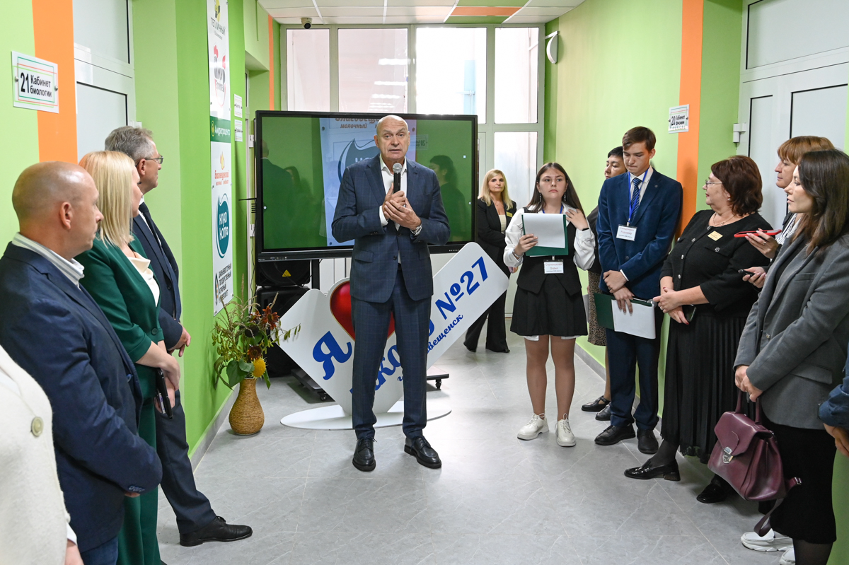 Яркий коридор в зеленых тонах сразу отсылает к теме сельского хозяйства. На втором этаже школы № 27 при поддержке партнеров — крупных предприятий Амурской области — сделали капитальный ремонт, полностью обновили кабинеты физики и биологии, закупили современное оборудование.