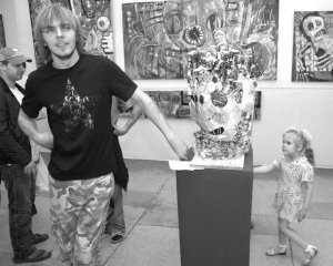 Похоже, данная экспозиция отвечает вкусу любого зрителя. Хотя принято считать, будто начинающие художники должны обязательно эпатировать публику, изо всех сил отходить от канонов, открытых их великими предшественниками. Радует, что далеко не все участники «Спичечной фабрики» придерживаются этого мнения. Оттого представленные работы получились очень разными. «Восемь молодых художников - и никто не похож друг на друга! - воскликнула дама средних лет, - у каждого свой стиль». Поклонники рок-музыки заинтересовались творениями Оксаны Бикининой, посвященными Егору Летову, недавно ушедшему в мир иной. Одно из них представляет небольшую фигурку лидера группы «Гражданская оборона». Преподаватель АмГУ кафедры дизайна Татьяна Аверина высоко отозвалась о работах всех своих воспитанников (большинство участников - студенты этого вуза). Она поименно назвала их всех: Наталья Горбатенко, Татьяна Ядыкина, Марина Королева, Алексей Геец, Алексей Очкалов, Оксана Бикинина, Евгений Гоменюк и Андрей Петров. Аверина приветствует их неуемное стремление к оригинальности, но признается, что лично ей по сердцу ближе произведения, выполненные в реалистической манере. Например, работы Татьяны Ядыкиной. - Они заставляют задуматься, - сказала студентка БГПУ Лариса. - если бы издавался альбом ее репродукций, я бы обязательно его приобрела. Здесь вся наша жизнь: вот расстаются двое бывших влюбленных, вот картина полного одиночества героини, где чувствуется - она выдержит боль, не сдастся. Желающие взглянуть на современный модернизм, на абстракцию поворачивали в зал, где в полной мере проявил себя Евгений Гоменюк. Молодой человек, объясняя зрителям суть своих творений, с шумом грыз огромную морковку. Это радовало, поскольку художник проявлял себя как инициатор правильного образа жизни. Андрей Петров, на которого кивали его коллеги - «он у нас главный», держался скромно. «У нас нет главных, все равны», и на вопрос, почему выставка называется «Спичфабрика», тяжко вздохнул: «Ни почему! Это чтобы все спрашивали». Как и прошлый раз, он не расстается с глыбой пустых жестяных банок. Год назад он их прикрепил к полотну, а сейчас, благодаря титаническому воображению, крепкой мужской рукой 5-курсника АмГУ спрессовал в одну кучу, и получилось еще одно «произведение искусства»! Алексей Очкалов проявил немалую фантазию, воткнув в массивную человеческую голову из пенопласта пластмассовые трубки. Публика не скучала: кто-то представлял, что это волосы, кто-то - разлетающиеся мысли и т. д. Может, и правда, в классических выставках нам порой не хватает задоринки, юмора, азарта? Больно уж все правильно, приглажено, академично. Наверное, так, если бы ни одно «но». На одной из абстрактных композиций Андрея Петрова аккуратно вклеены... две фотографии Адольфа Гитлера. На лице у фюрера - добродушная улыбка, рядом с ним - симпатяга пес. Я оторопел: «Зачем здесь нужен Гитлер? Ваша работа не объясняет его чудовищной сущности. Он же 50 миллионов человек отправил на тот свет!» «Да я без всякой мысли фюрера прикрепил, - объяснил Андрей. - Да и не первый раз я их использую. Это же просто стеб»... Без комментариев. Не хотелось бы заканчивать свой репортаж на такой грустной ноте. А потому повторюсь: выставка молодых ребят стоит того, чтобы ее посмотреть. А продлится она до 26 июня.