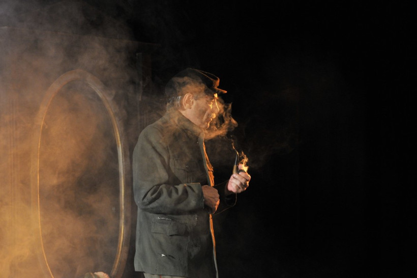К. К.-П.: По этому поводу мы долго спорили: нужен или не нужен, в конце концов оставили. И в начале я появляюсь из гроба, как черт из табакерки. (Кстати, там очень уютно — мягко и тепло, мы даже валетом с Ирой ложимся). Спектакль, по-моему, меняет отношение к смерти. Что такое смерть? Это — другой дом, где мы все будем жить.