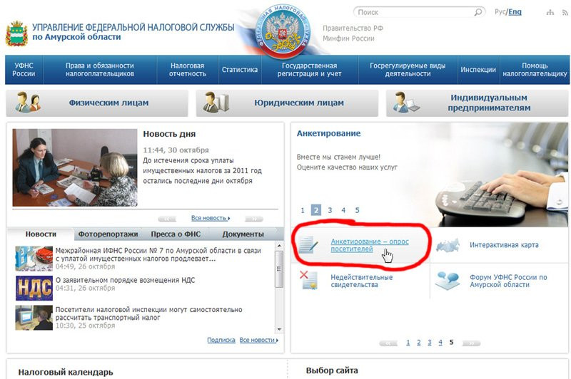 В разделе «Анкетирование» всем посетителям предлагается высказать мнение об уровне обслуживания налогоплательщиков в территориальных налоговых органах Приамурья. Выбрав свой регион и необходимую инспекцию, нужно указать, кто вы (юридическое или физическое лицо, или индивидуальный предприниматель), когда и с какой проблемой обращались и какой ответ получили.