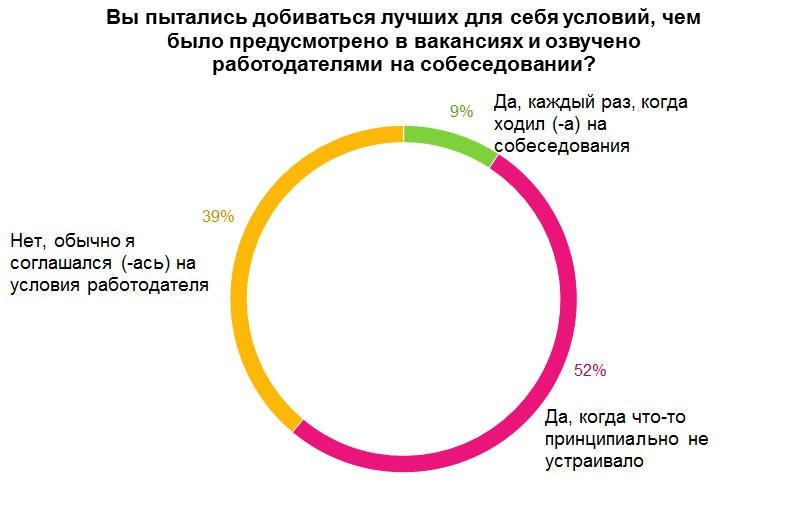 Большинство работников, которые неизменно соглашаются на озвученные работодателем предложения, указали, что условия труда их всегда устраивают. Некоторые респонденты уточнили, что они не принимают приглашения на собеседования на позиции, условия которых их заведомо не нравятся. 29% считают, что торг на интервью неуместен, а 16% просто скромничают.