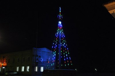 На то, чтобы украсить мачту связи, «Амурским коммунальным системам» потребовалось 8 ниток гирлянды с 16 светящимися каплями на каждой. Размер капель — около одного метра. Мачту наряжали почти неделю, при помощи автовышки. Раньше АКС устанавливали во дворе настоящую живую елку, но потом решили украшать мачту.