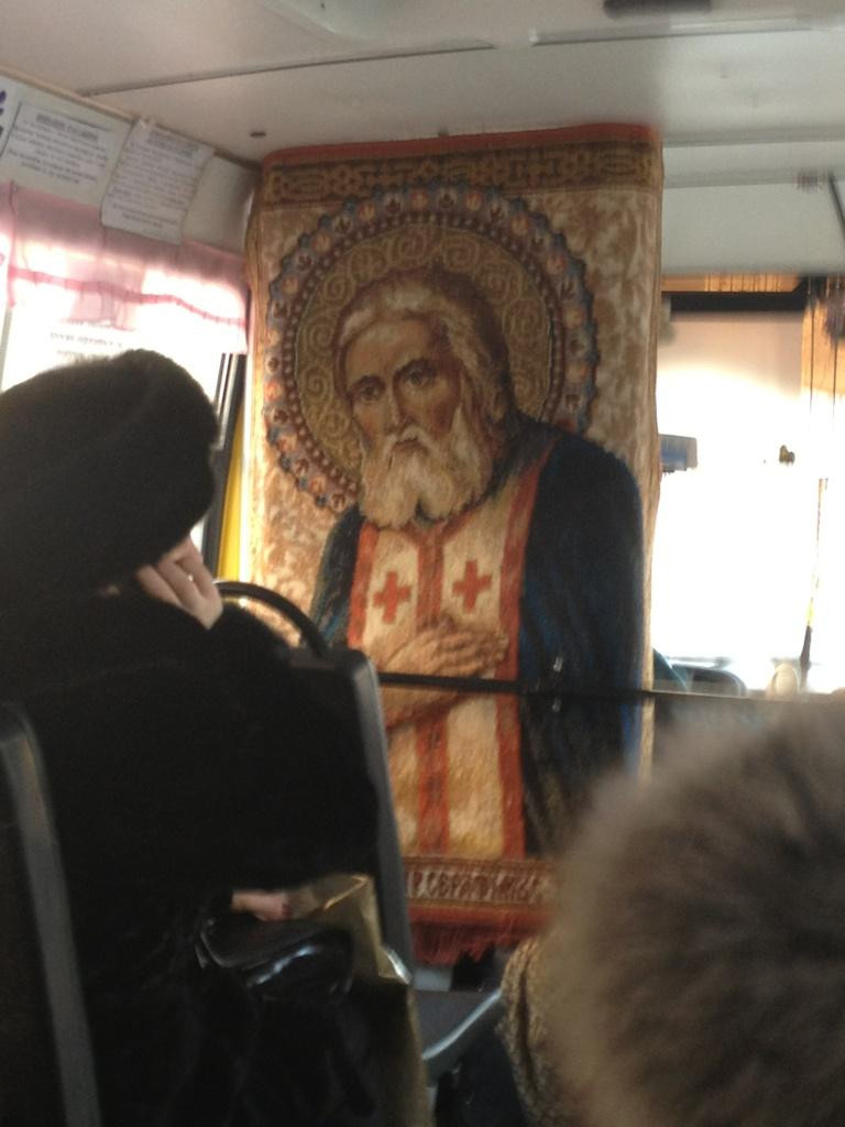Образ преподобного Серафима Саровского увидел в одном из маршрутных автобусов Благовещенска горожанин Николай Чирков. Как отмечают в Благовещенской епархии, такие коврики находятся в свободной продаже. «Поместить изображение Серафима Саровского в автобусе — это определенная смелость со стороны водителя, своего рода исповедничество, — считает пресс-секретарь епархии иерей Святослав Шевченко. — У водителей в кабине можно часто увидеть иконки, крестики, четки, ведь дорога — это место повышенной опасности. Недаром говорят, что на войне неверующих нет, а дорога сегодня — та же война, количество погибших и пострадавших в ДТП исчисляется тысячами».