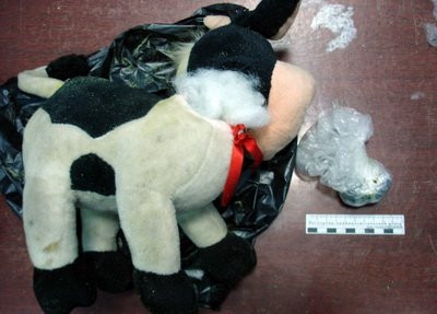 В рейде участвовал специалист-кинолог со служебно-розыскной собакой, которая и указала на подозрительную посылку. В ней находилась мягкая игрушечная корова, в которой нашли более 21 грамма гашишного масла, запакованного в полиэтиленовый пакет. Это 220 разовых доз. Вся детская игрушка была обильно посыпана приправой от лапши быстрого приготовления.