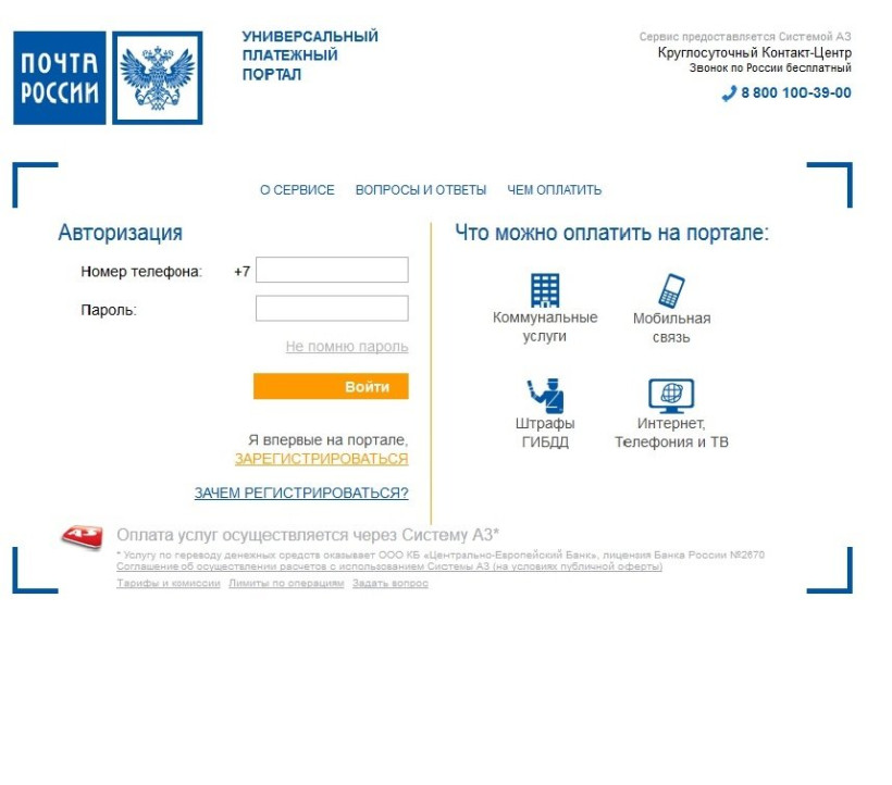 Чтобы оплатить услуги, необходимо зарегистрироваться на портале. Для этого придется указать номер мобильного телефона, имя, фамилию, e-mail, кодовое слово и придумать пароль. «Для подтверждения оплаты граждане могут заказать доставку бумажной справки с печатью банка. Кроме того, история всех операций, совершенных через портал, будет храниться в системе, и при необходимости можно будет заказать справку о платежах за любой выбранный период», — отмечается в пресс-релизе «Почты России».