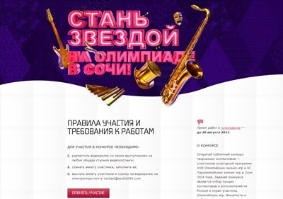 Чтобы принять участие в конкурсе, достаточно разместить видеоролик со своим выступлением на любом общедоступном видеохостинге и прислать ссылку на видеоролик и информацию о себе по электронному адресу contest@sochi2014.com, сообщает пресс-служба оргкомитета «Сочи 2014». Можно также отправить видеоролик на цифровом носителе вместе с заполненной регистрационной формой по адресу: 105005, город Москва, а/я 154 для ООО «ЭсКаСи».