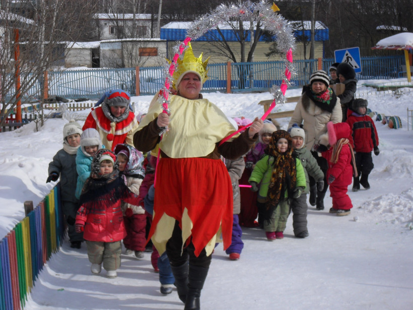 Детсадовцы Талакана вместе со своими родителями уже отпраздновали Масленицу. Сегодня педагоги детского сада «Радуга» организовали для ребят и их родителей небольшое представление на улице.