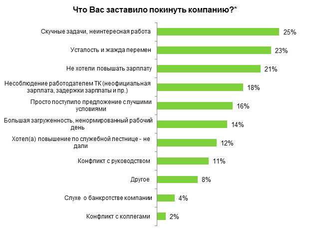 Четверть респондентов уволились из-за неинтересной, скучной работы. Зарплата не устраивает 21 % опрошенных, а 18 % ушли из-за несоблюдения работодателем Трудового кодекса. Еще 14 % респондентов устали от постоянных переработок, 12 % жаждали карьерного роста, но на текущем месте не смогли его добиться, а 11 % опрошенных в один прекрасный день не сошлись в интересах с руководством. Повышение зарплаты могло бы предотвратить уход более чем половины желающих сменить место работы. Почти каждого второго остановило бы предложение подходящей позиции.